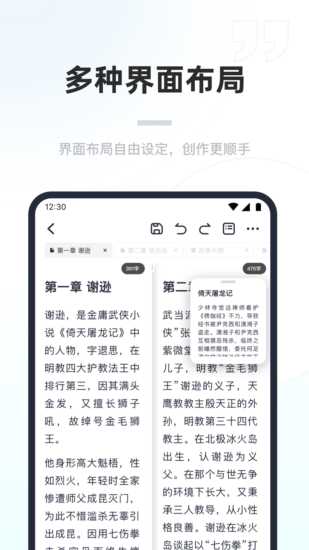 与常规小说创作软件不同,支持局部文字变色、加粗、倾斜等,创作时标记内容,便于后期修改和润色