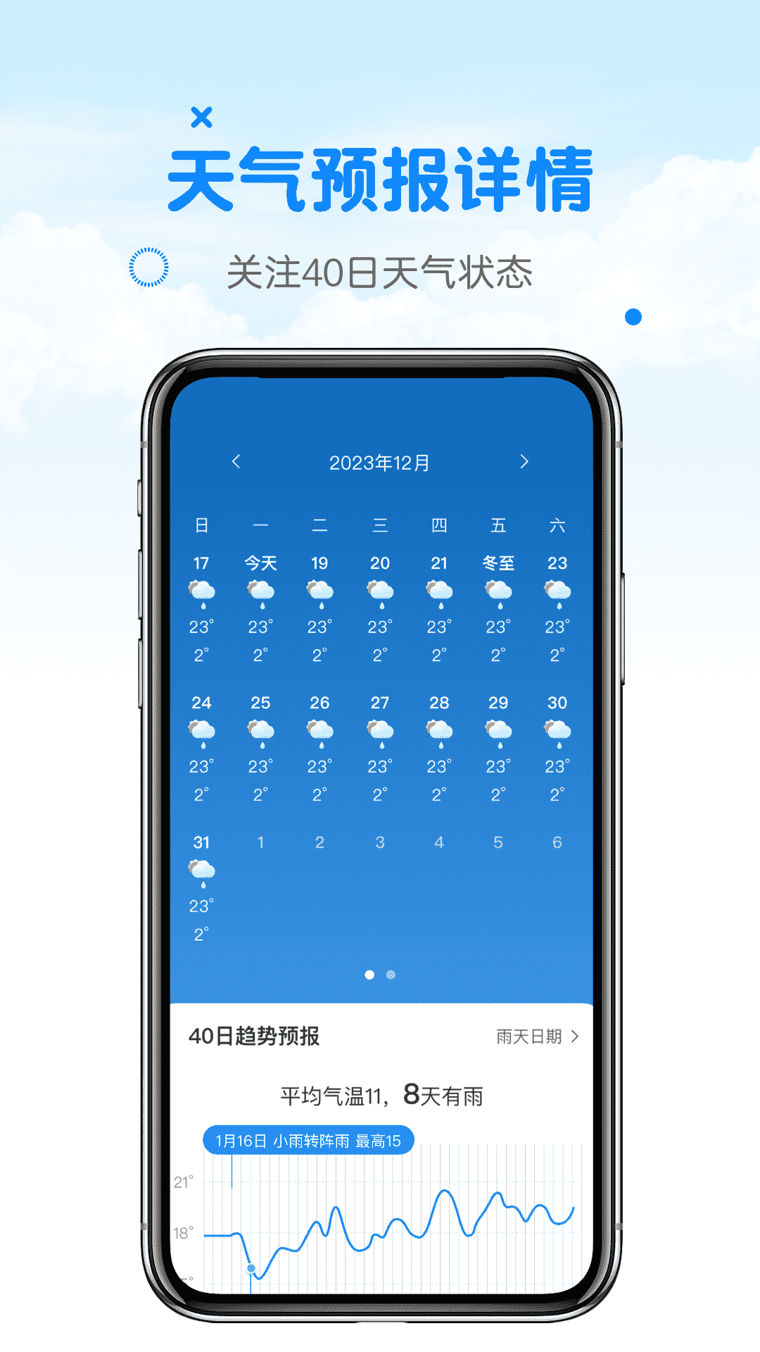还可对未来一个月的降雨情况(何时下雨、下雨天数)以及降温情况(何时降温、降温持续时长)进行明确预报,这种清晰的预报有助于您合理安排生活。