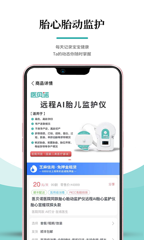 在医小租平台上,有【医院同款胎心监护仪】可供租赁。对于处于孕晚期的准妈妈们来说,居家就能使用这款胎心监护仪进行胎心监护。这里还有医学专家提供24小时报告解读服务,同时借助Ai评分判读,一旦胎儿有缺氧情况能够及时预警,针对高危妊娠还会发送短信通知,让准妈妈们在孕晚期能安心度过,有效缓解孕期的担忧。