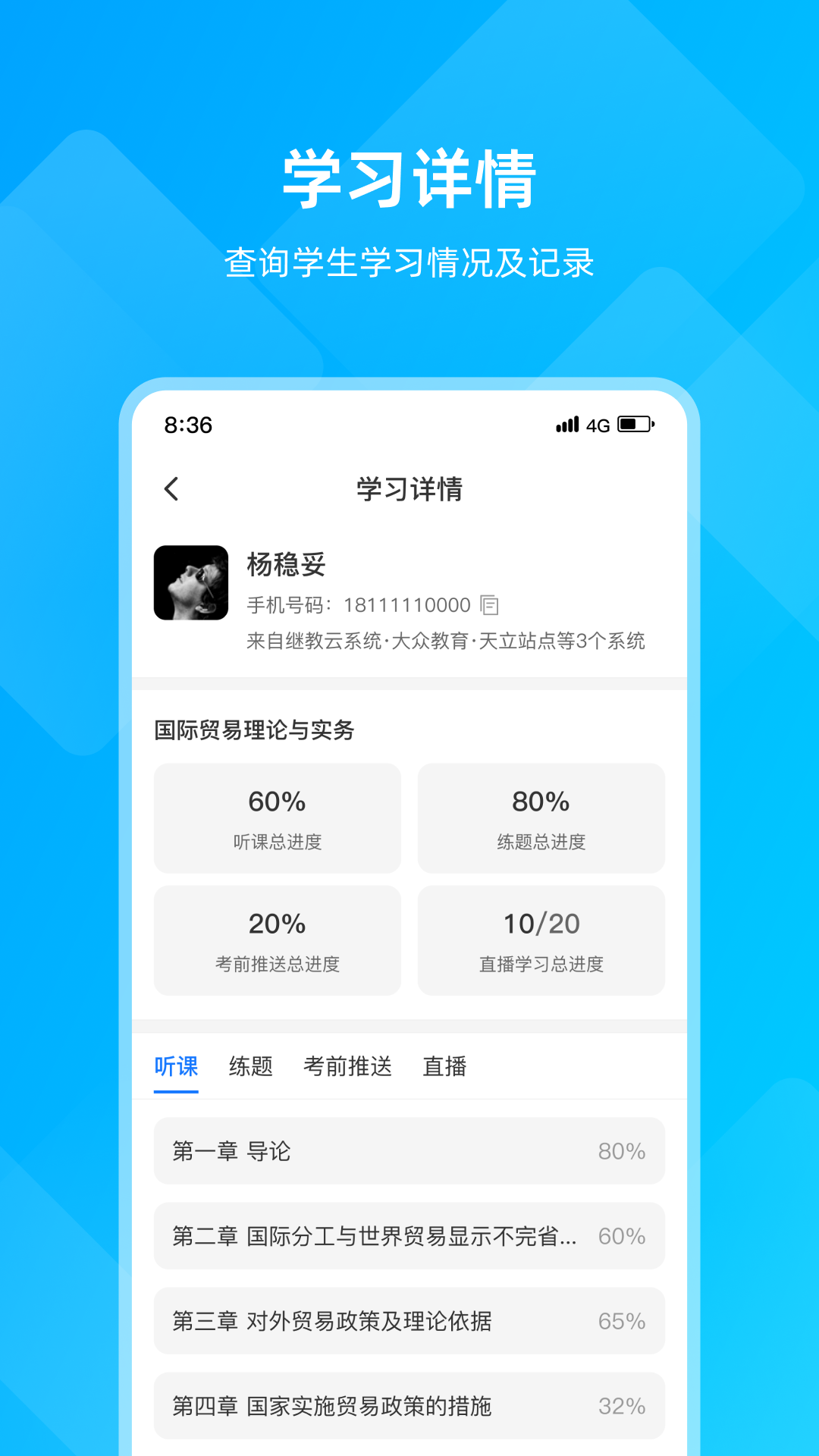 【学生详情】可以查阅学生基本信息、订单信息、学习记录等。