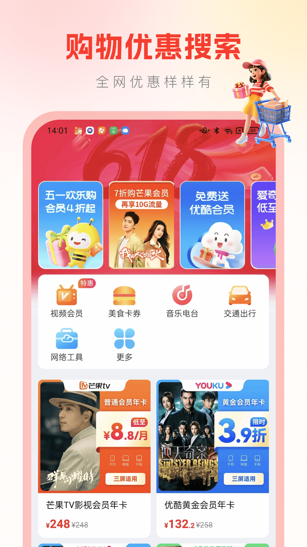 【购物优惠搜索】视频会员、美食卡券、音乐电台、交通出行等优惠样样有;
