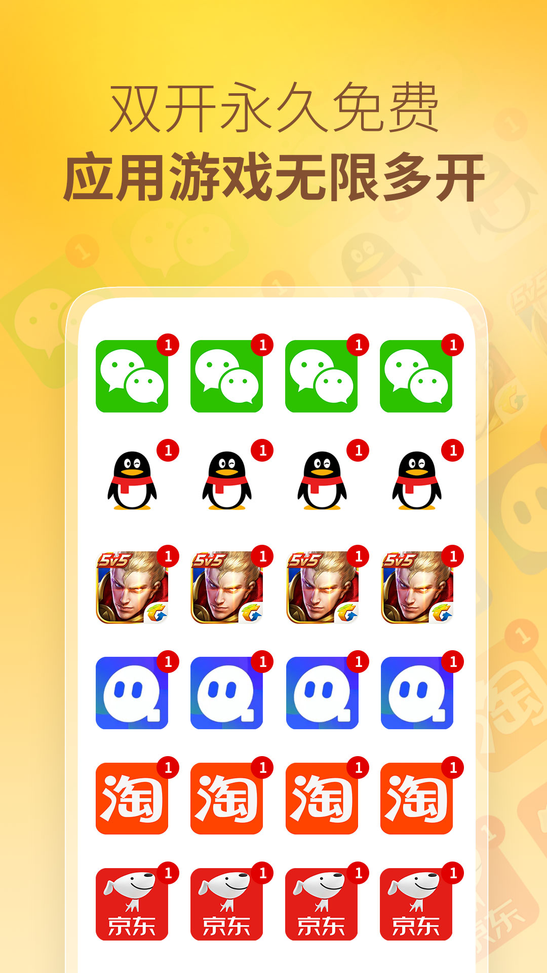 王者分身是一款能够实现应用游戏无限多开的分身软件。借助它,只需一部手机就能轻松让微信、QQ、淘宝、陌陌等众多应用分身,使多个账号同时在线,无论是日常交友、游戏娱乐,还是工作生活,它都是您的理想之选。