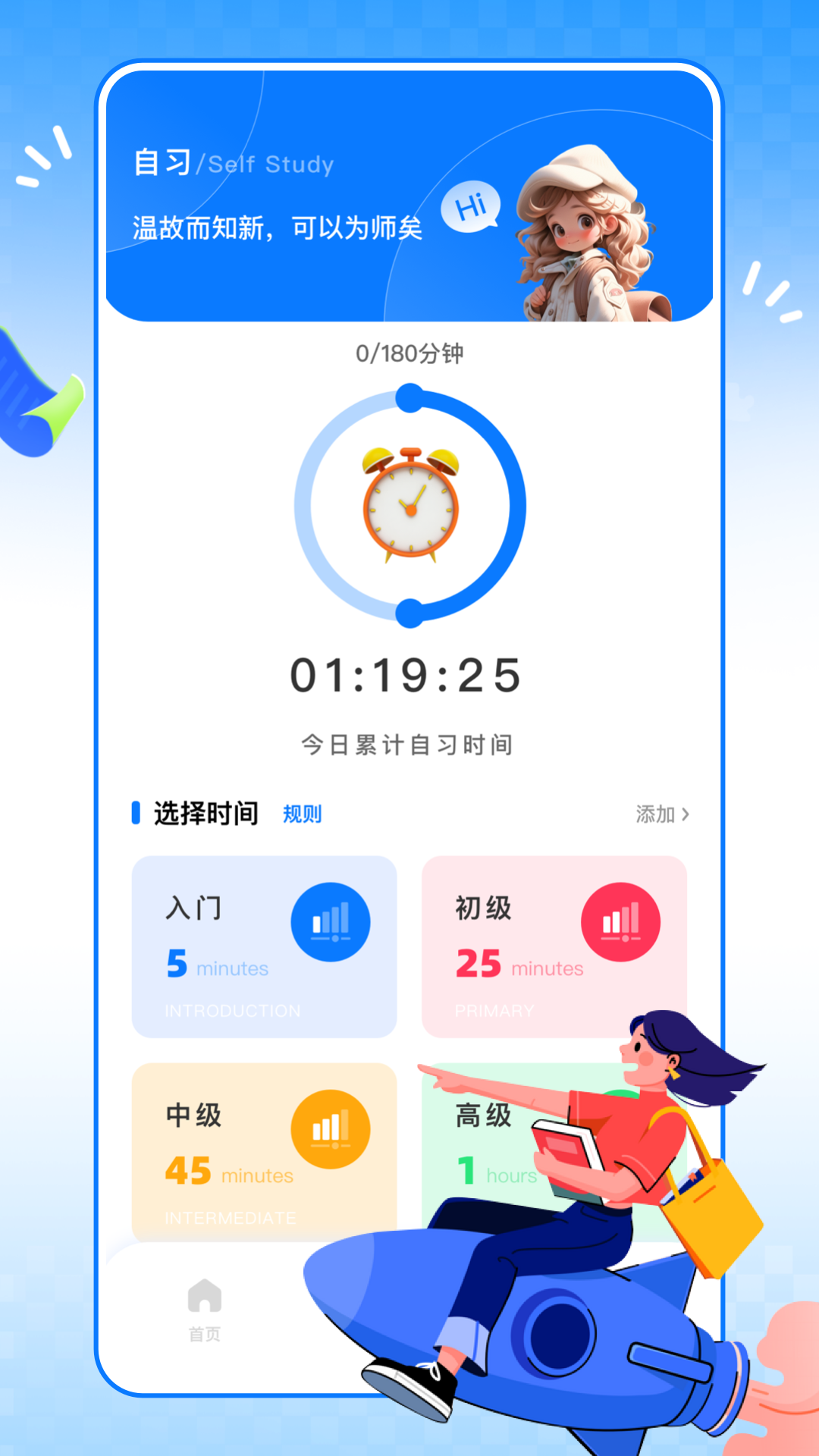 此外,《英华学堂》还为用户打造了在线自习室。在自习室中,用户需要在限定的时间内认真学习,这有助于提升用户的自我控制能力。