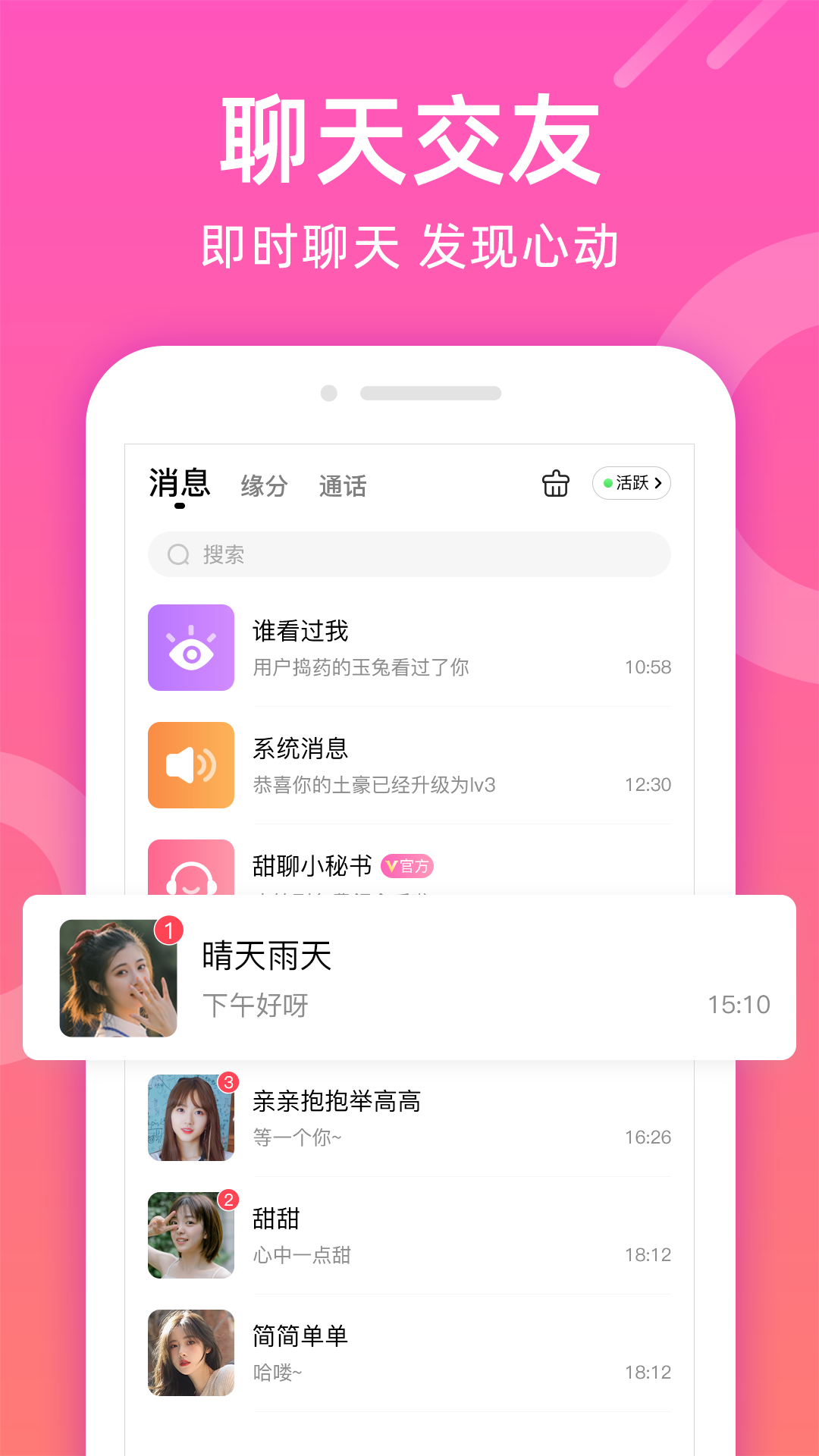 甜聊,一款超棒的聊天交友软件。在这里,你可以即时聊天,尽情倾诉内心的温暖情感,它能让恋爱交友这件事变得无比简单。甜聊为用户提供文字、语音、视频等多样化的交流方式,从而创造出更多邂逅爱情的机会。不管你想寻找什么样的人,来甜聊就对了,这里应有尽有。
