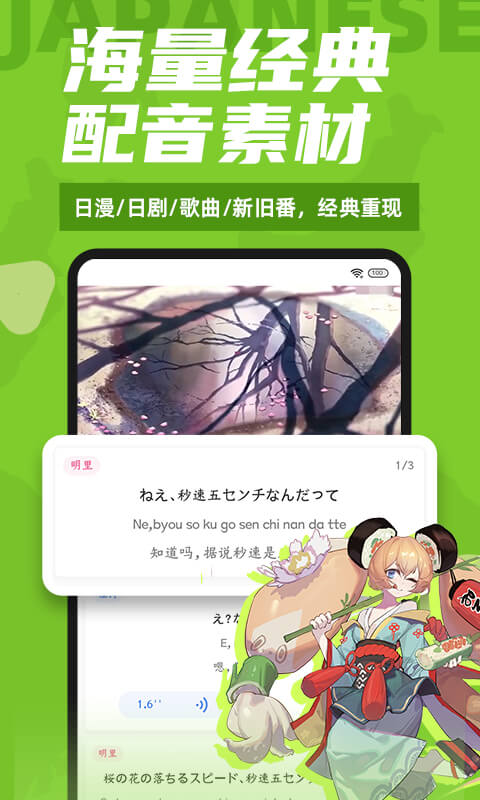 - 日语配音练习:有海量经典动漫片段可供选择,趣味日语配音能让你模仿出地道的日语发音。