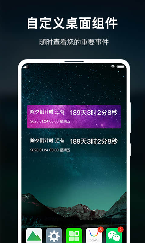 - 灵活可定制:灵动的倒计时风格,可定制背景、文字的颜色、事件颜色,您的地盘您做主;