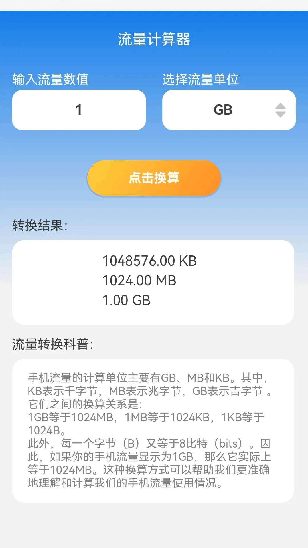 【流量换算】输入数字和单位就可以换算;
