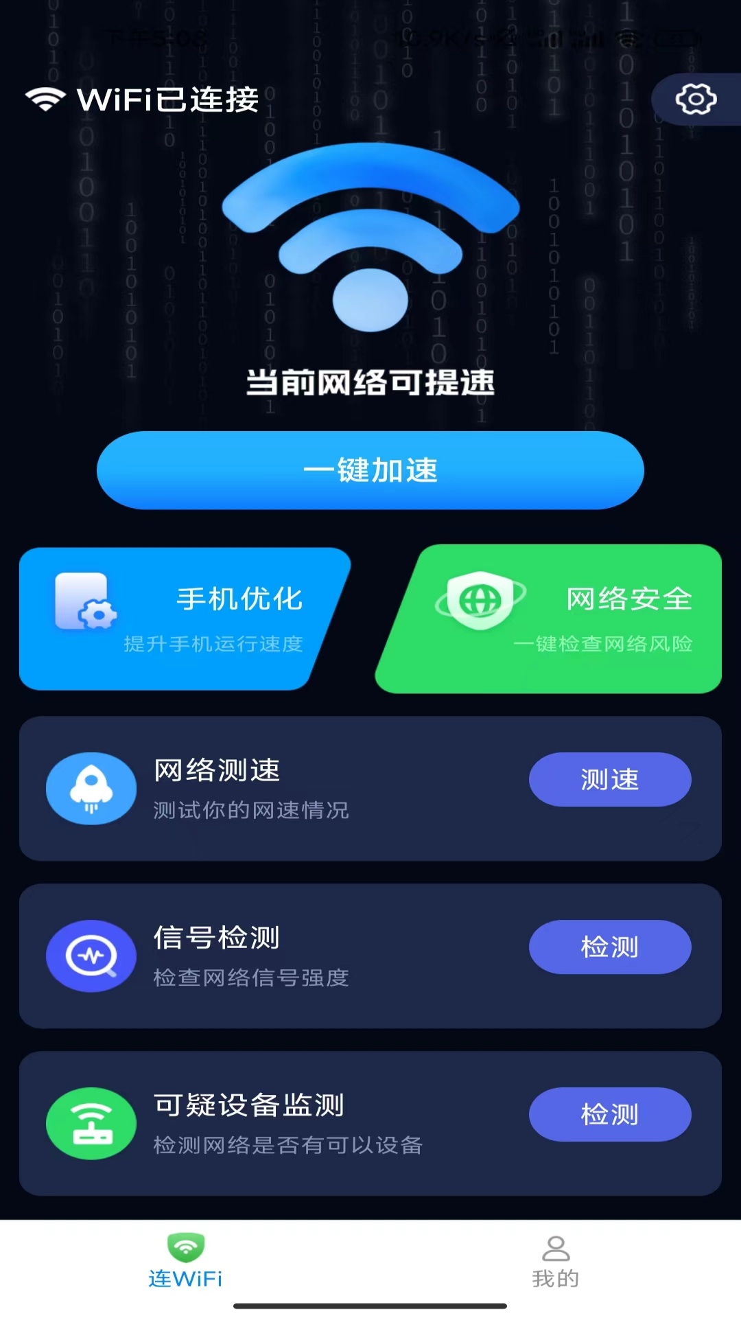 明月流量不仅可以一键帮助你网络加速,还能为你提升手机运行速度和检查网络风险安全。