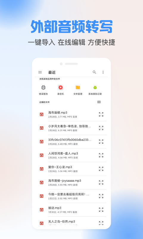 这款软件适合多种人群使用:对于商务人士来说,在会议时进行记录或者对语音访谈进行记录时,可以将语音转成文字输出纪要;老师和学生群体,在课堂上录音之后,课后把音频导入软件,一键就能转换成文字,并且还能在线对笔记内容进行修改;对于老年群体而言,这款软件操作简单,容易上手,从而免去了他们不会打字的烦恼。
