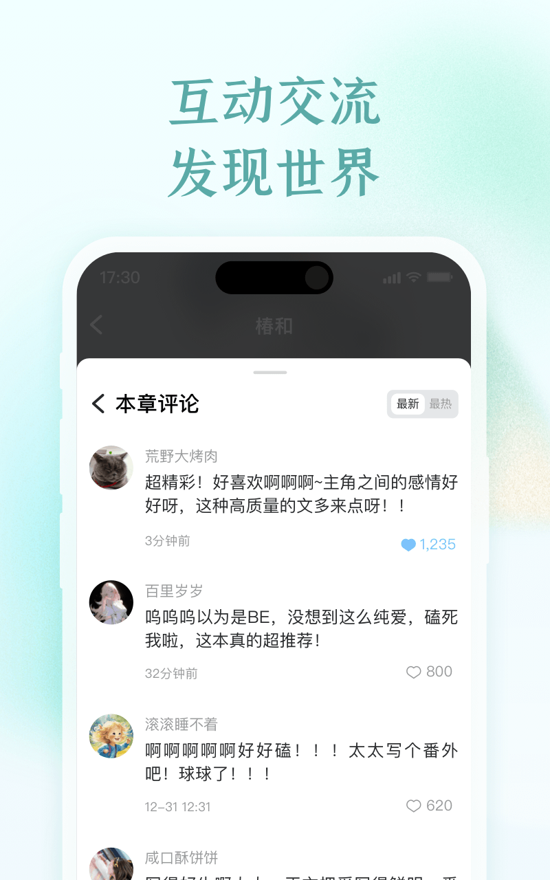 在椿和这个平台上,您能够随时分享自己的看法,聆听他人的观点,与其他读者共同分享阅读时的快乐与收获心得,进而发现更多令人心动的精彩瞬间。