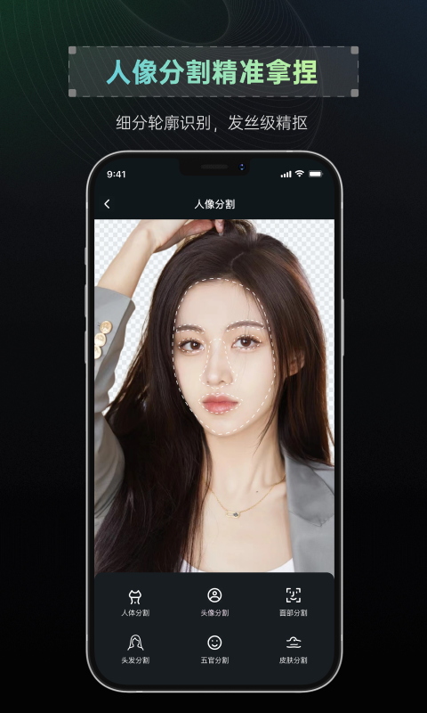 采用智能识别分割技术,支持对人体、头像、面部、头发、五官、皮肤进行分割。