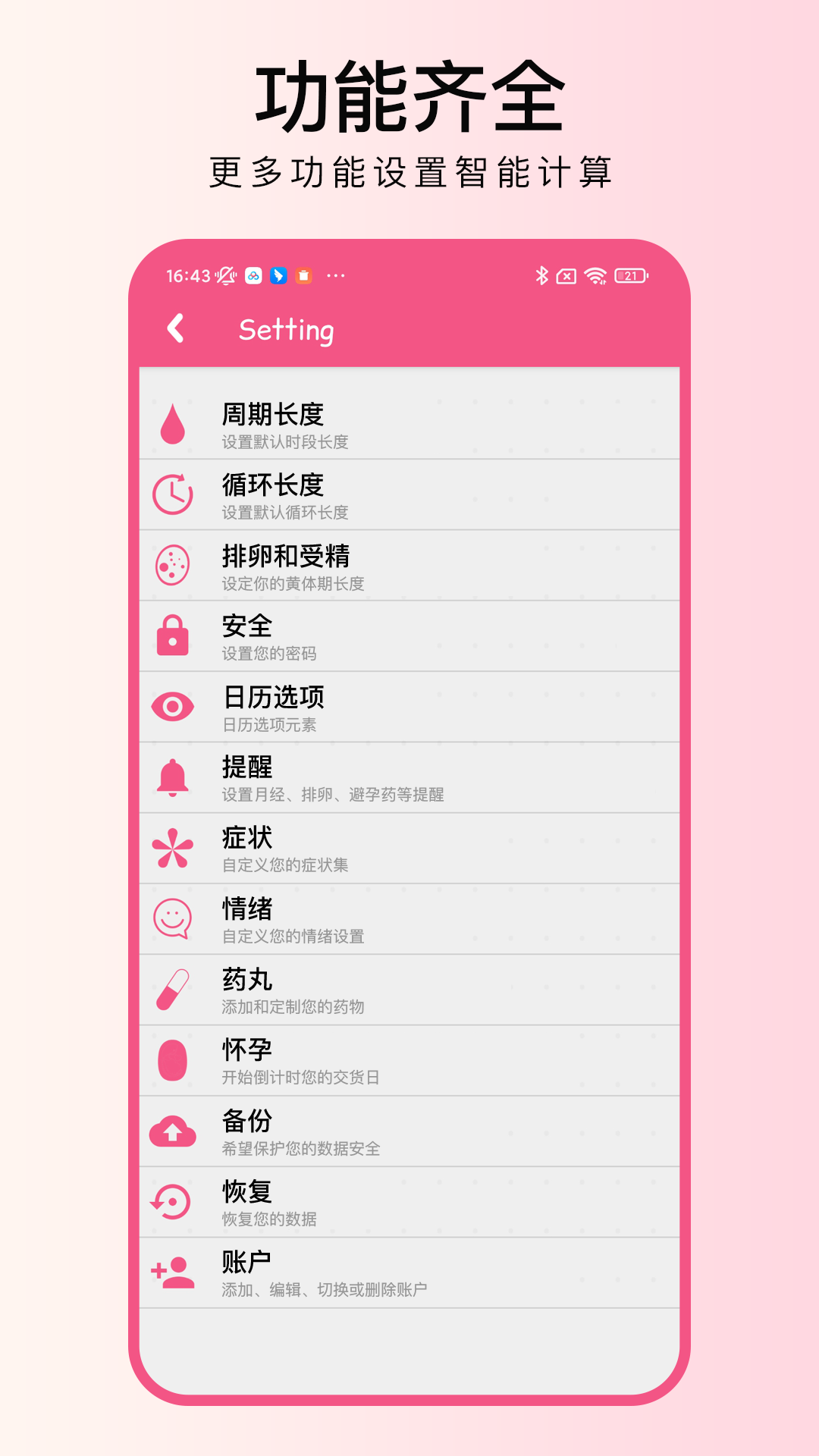 以记录的数据为依据,精准地预测经期,提前发出通知。并且能够推算出排卵期和安全期。