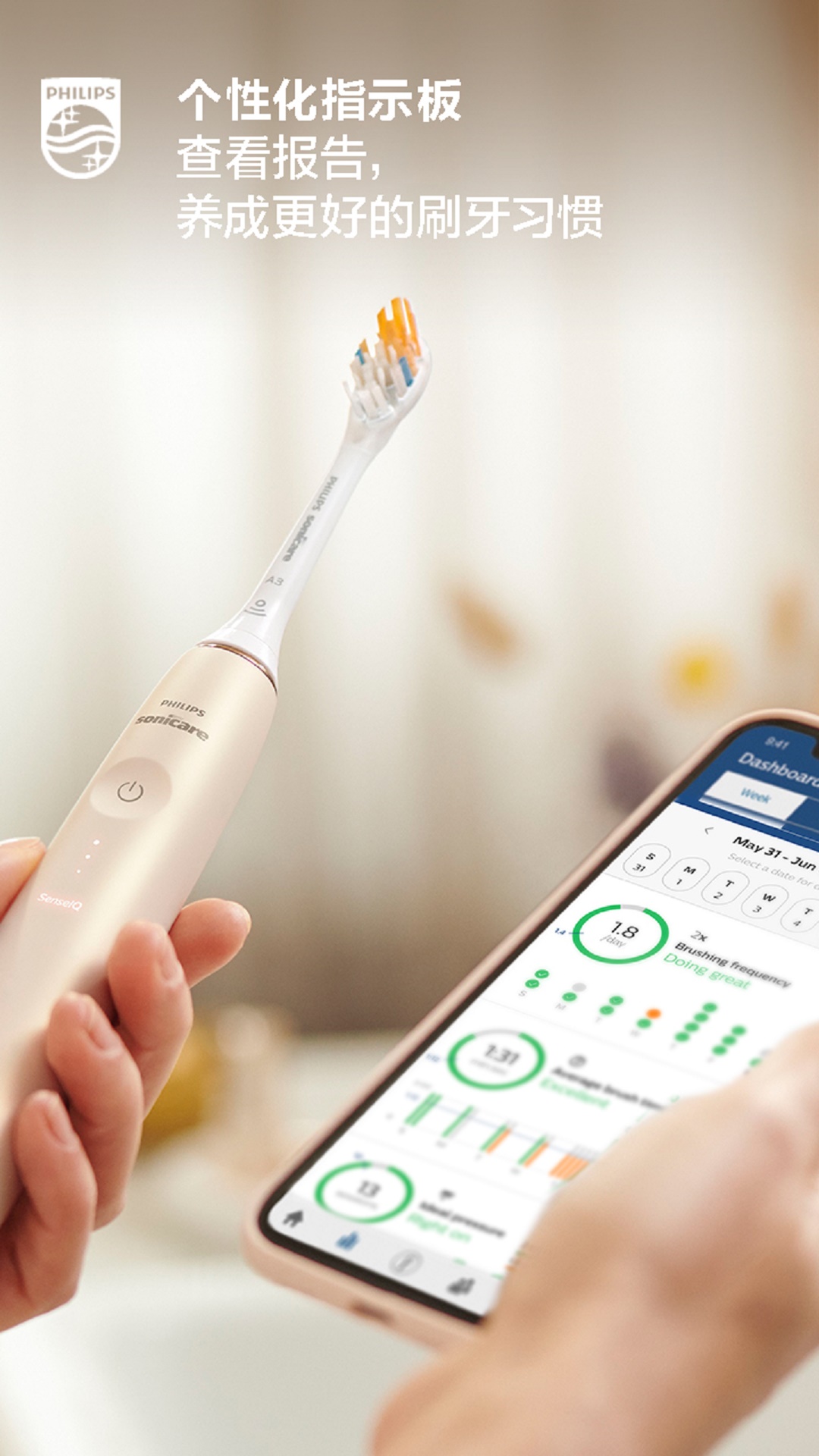 您可将飞利浦Sonicare应用视为能直接与之交流的口腔健康指导者。能够一起设定目标,改善口腔健康状况、优化刷牙时长,绽放更健康的笑容。