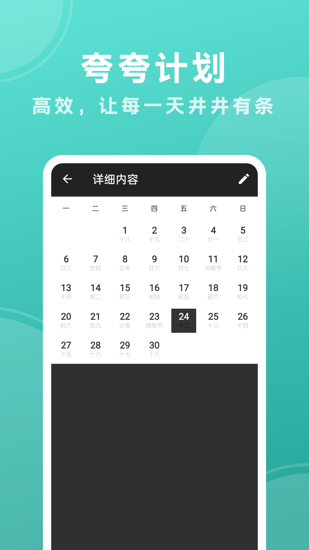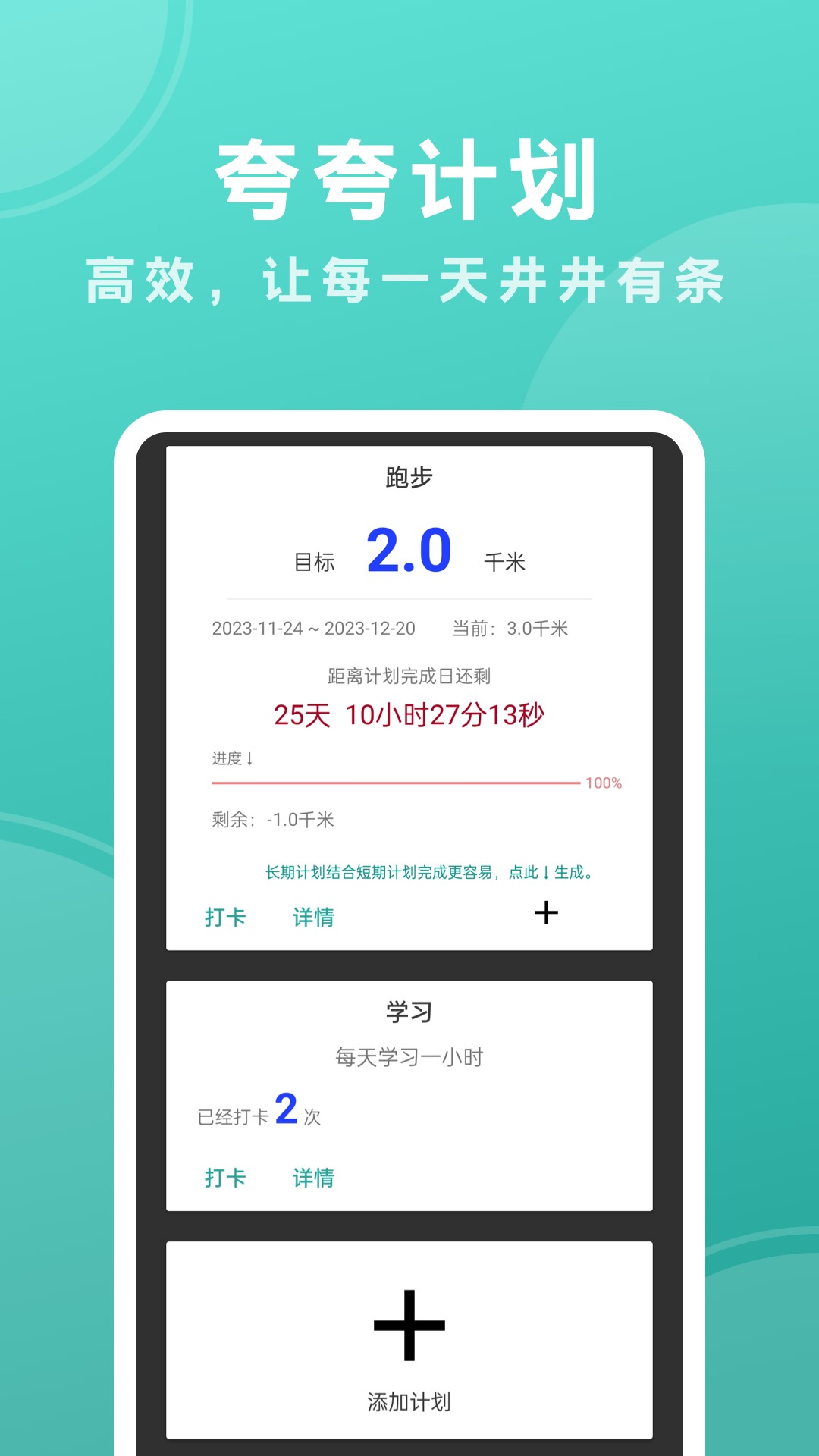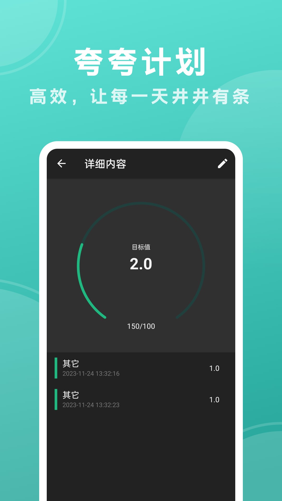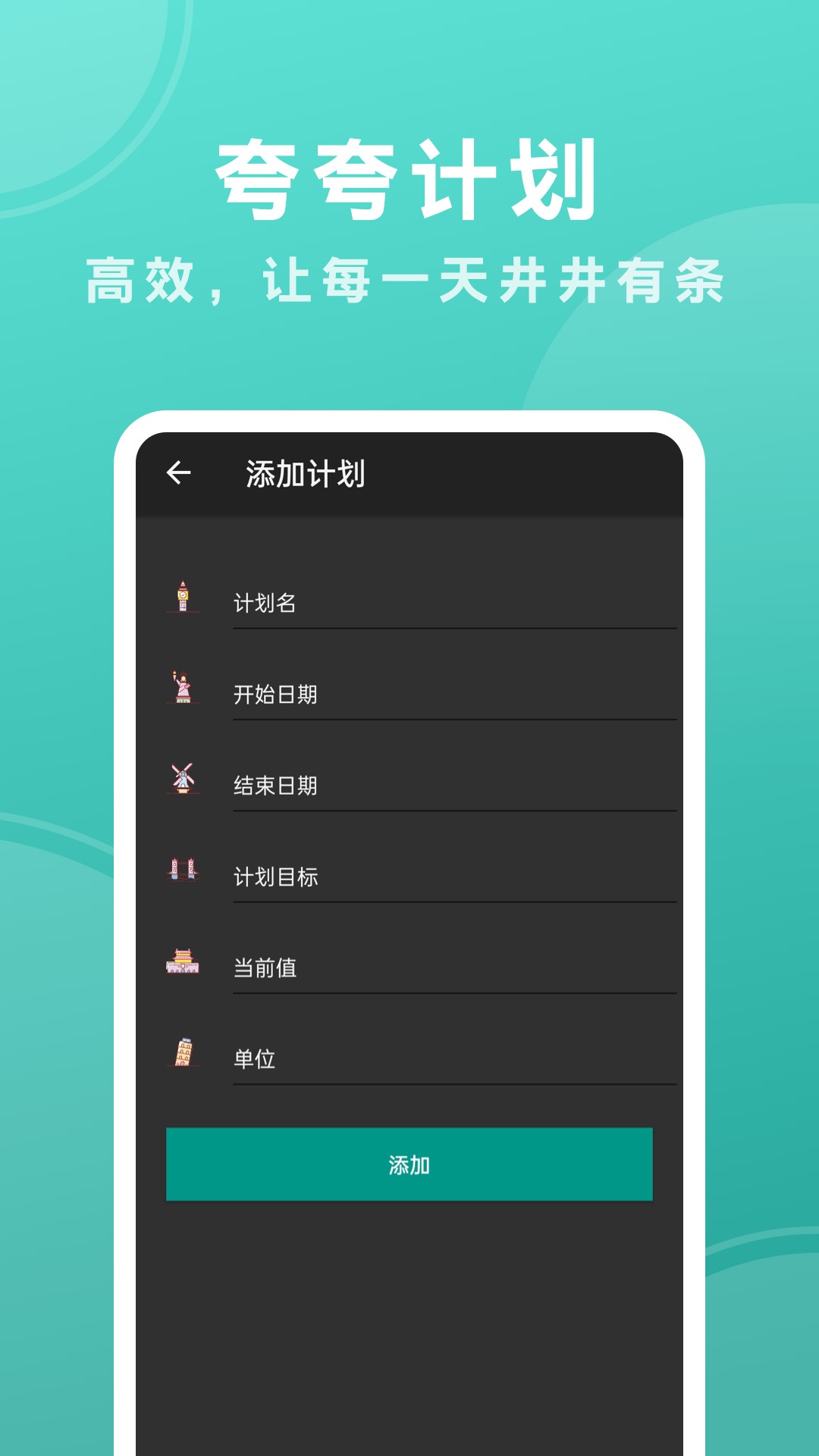 单个计划事项添加:此外,夸夸计划还支持添加单个的计划事项,您能够为每日的工作和学习列出清单,鞭策自己不断进步,变成更优秀的自己。