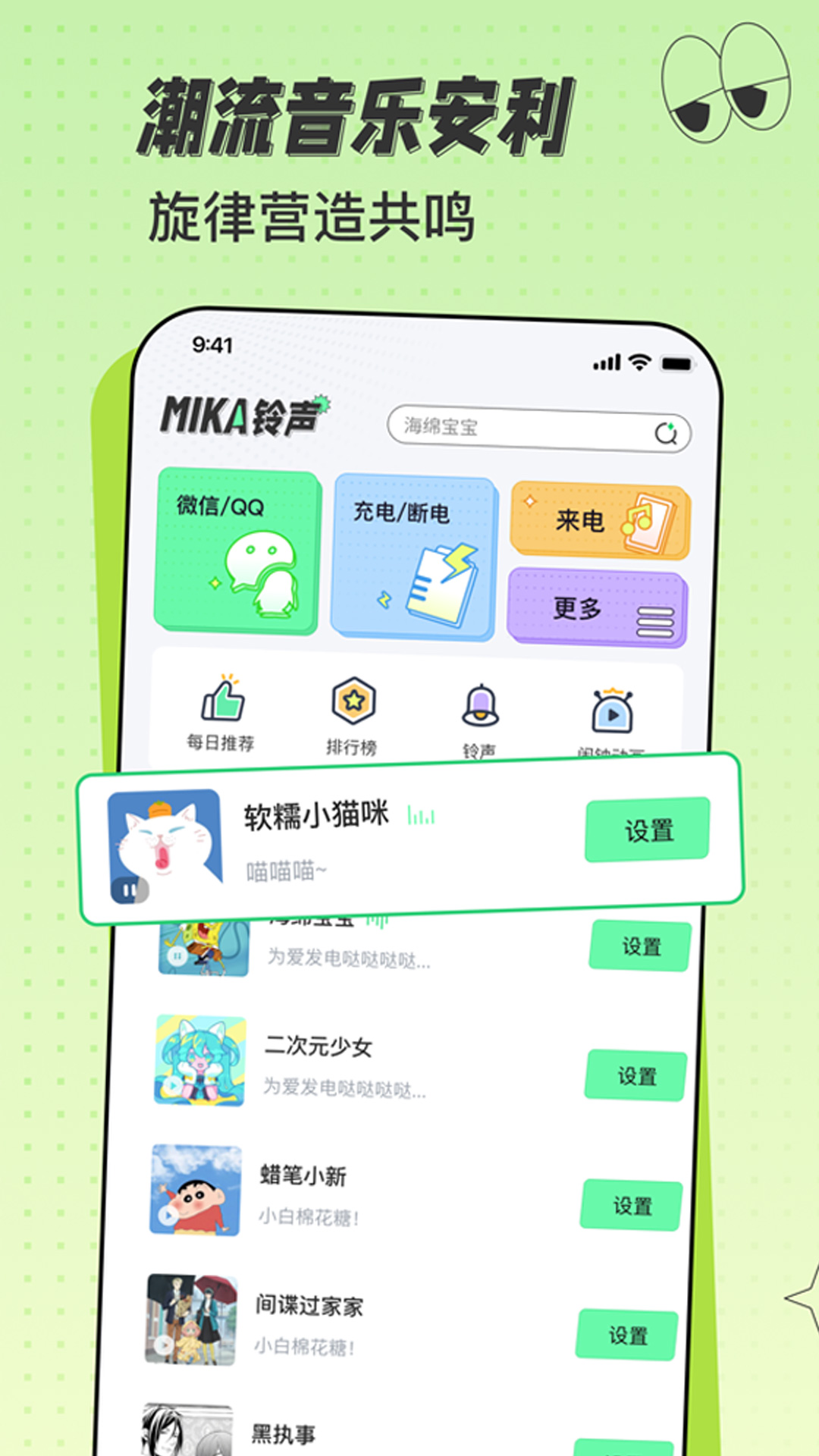 你是否已经厌倦了千篇一律的系统铃声?是否还在苦苦寻觅能让自己心动的手机铃声呢?米卡铃声就能满足你的需求。它拥有海量的铃声资源供你挑选,更为独特的是,它支持原创铃声社交。你可以为心中的那个“ta”设置独一无二的专属铃声,在这里,你能够自己动手制作铃声,并通过铃声展开社交互动。