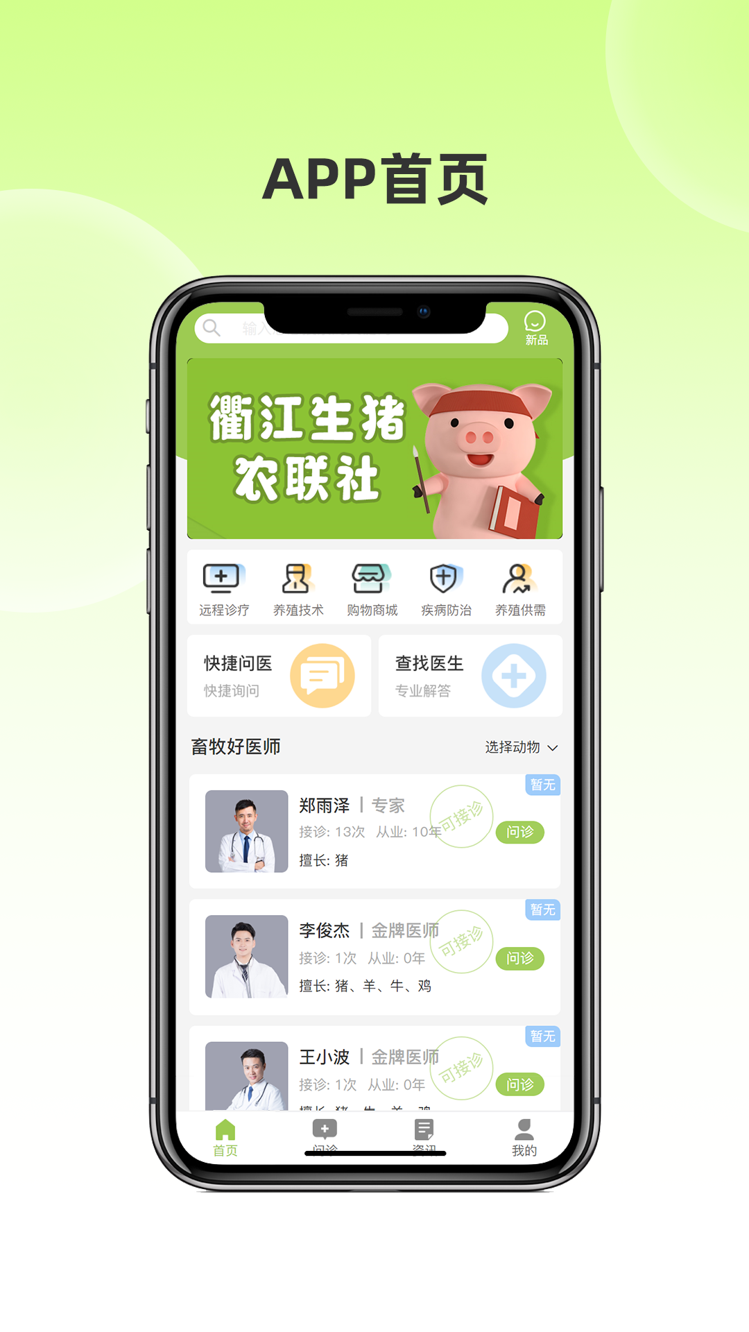 衢江生猪农合联智慧云app是一款专业的畜牧养殖服务应用。衢江生猪农合联智慧云app内有畜牧专家入驻,可以网上为畜牧义诊,全程都是网络服务,方便快捷,还可以和兽医师一对一的交流,同时衢江生猪农合联智慧云app提供丰富的行业商品,用户可以便捷购买。