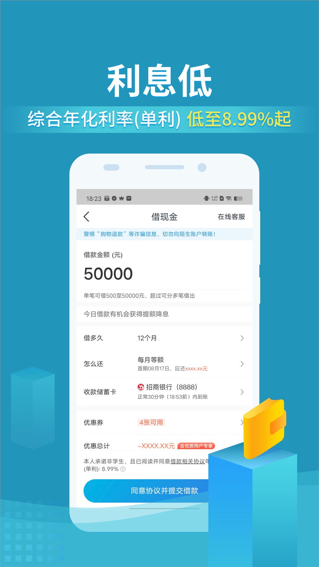 利息低:综合年化利率(单利)低至8.99%起