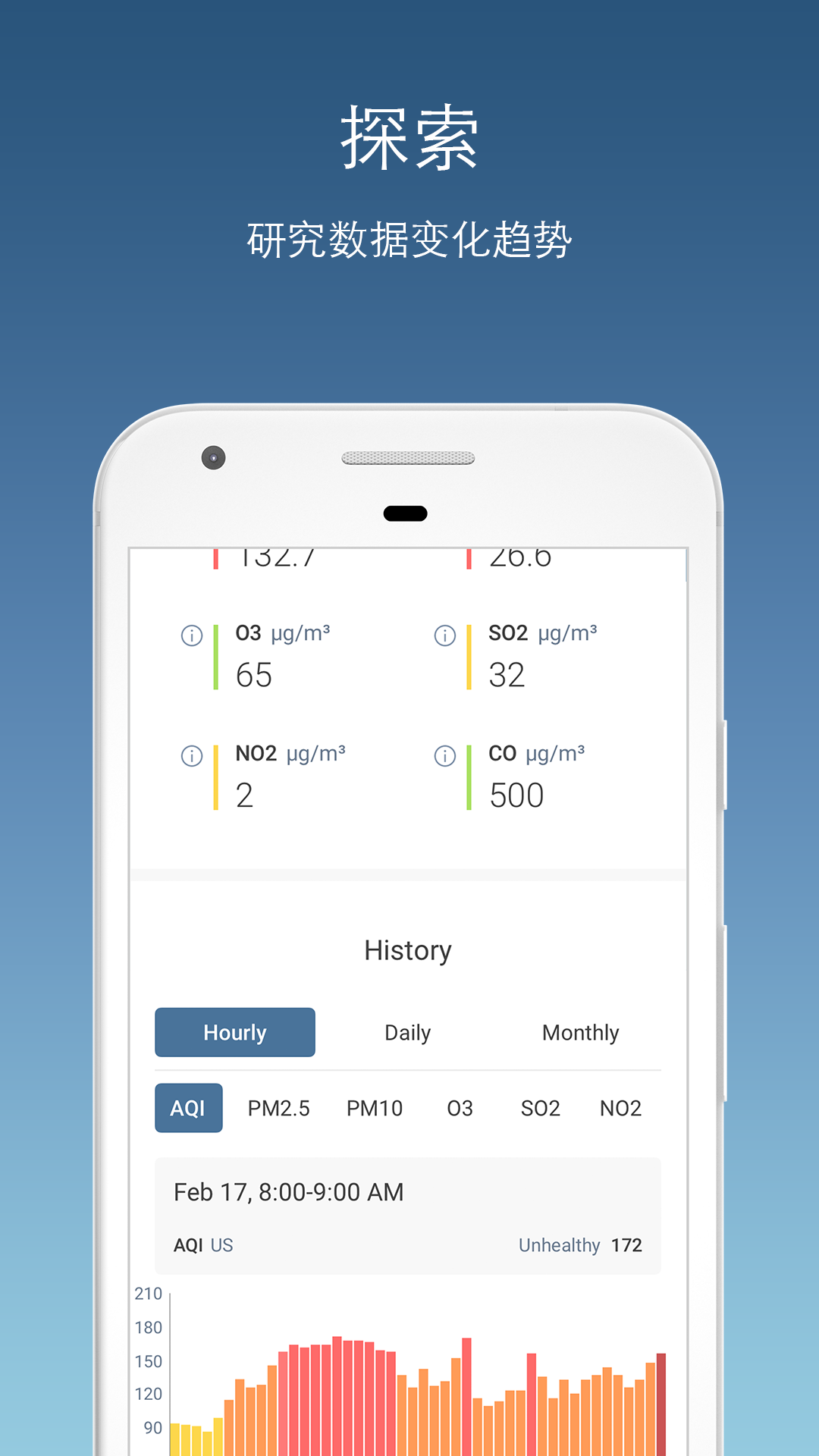 +实时监测六种主要污染物:追踪实时PM2.5,PM10,臭氧(O3),二氧化氮(NO2),二氧化硫(SO2)和一氧化碳(CO)浓度。