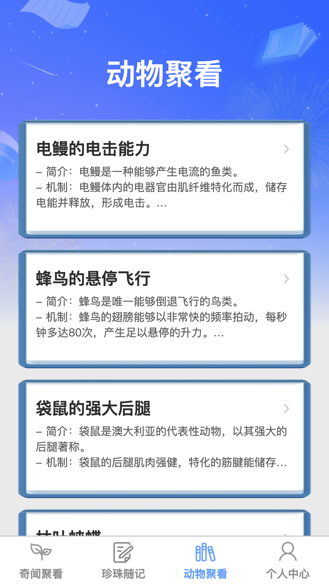 【动物聚看】在动物聚看中,你可以探索各种动物的奇妙世界,了解电鳗的电击能力、蜂鸟的悬停飞行等动物知识。每一个动物都有它独特的特性和生存技巧,让你感受到自然界的神奇和多样。