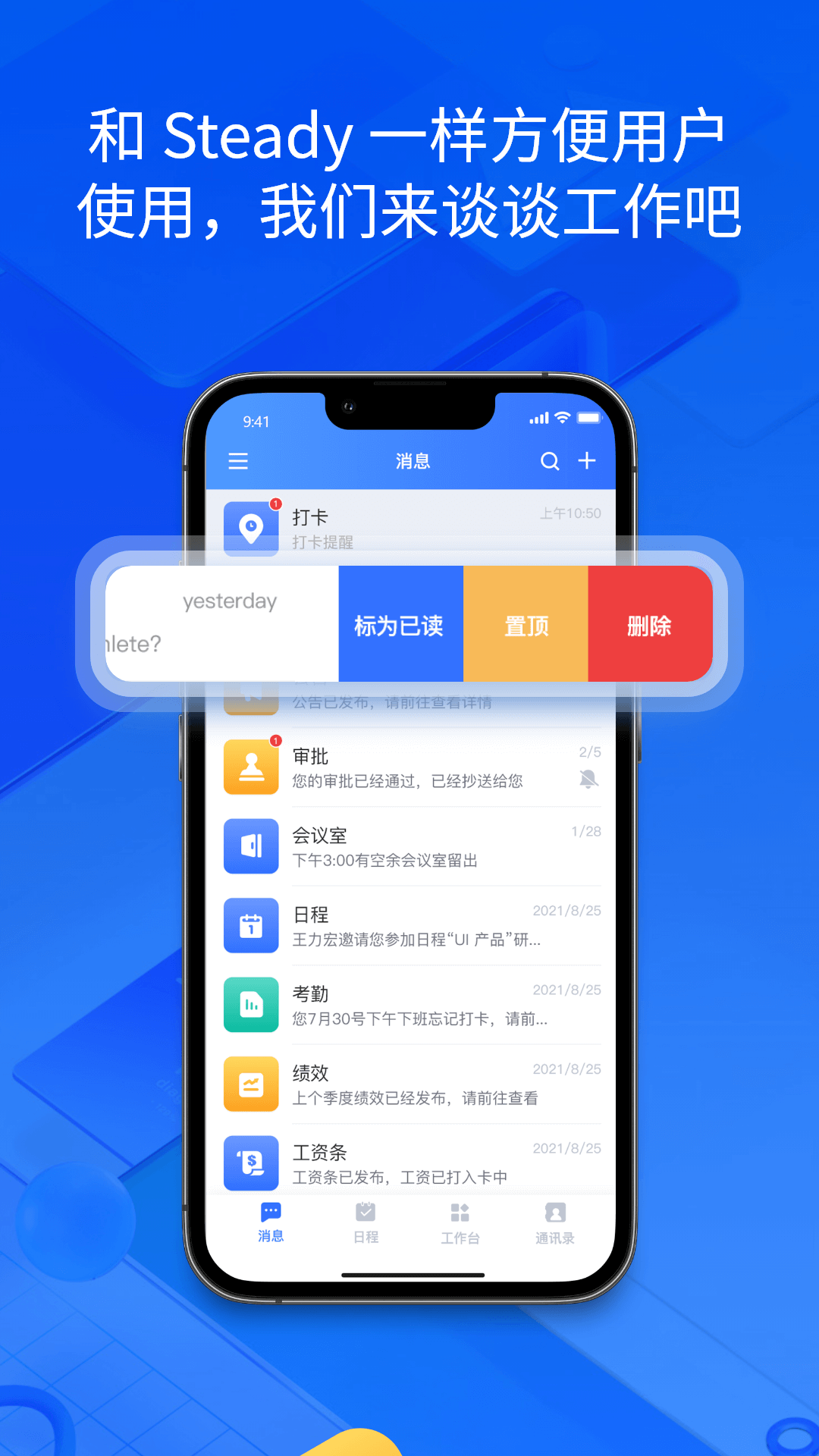 Steady@Work是一款企业即时通讯办公工具,旨在助力企业减少沟通成本、提升协同效率、实现高效沟通与管理,进而提高办公效率。