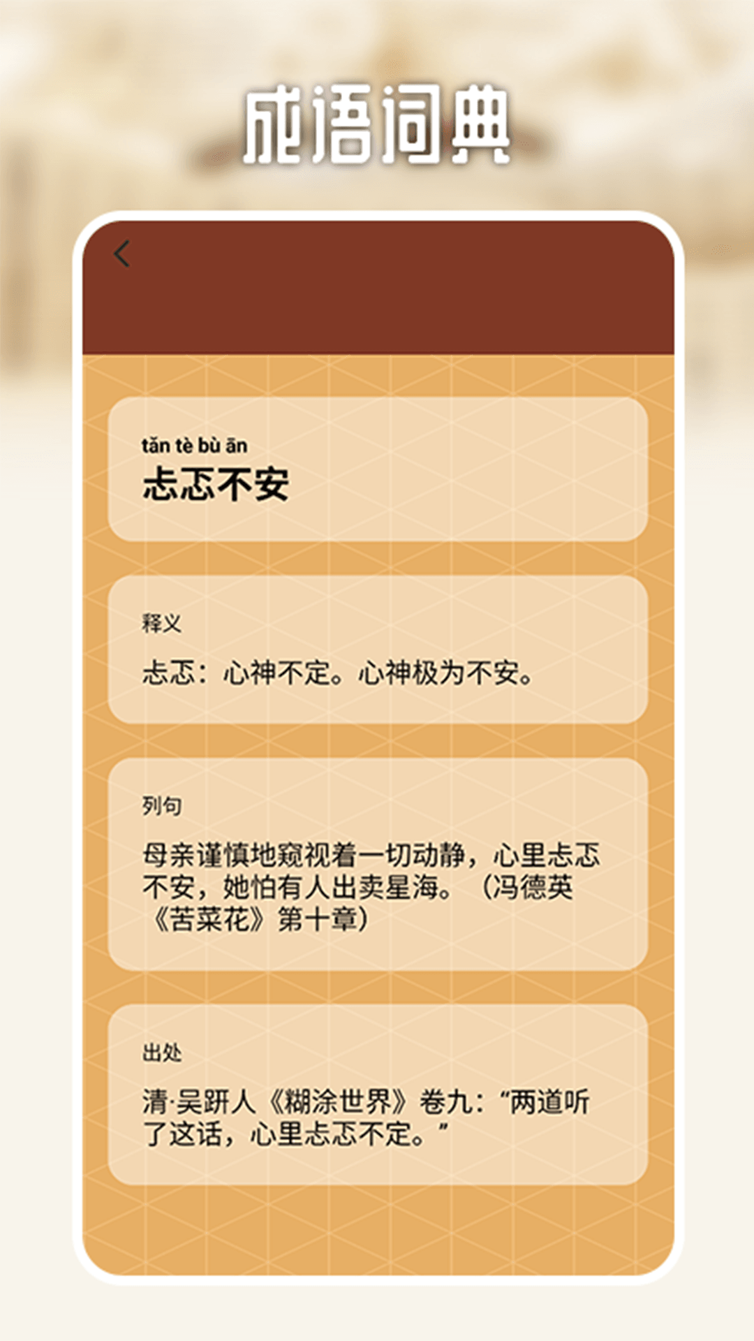 而APP中的成语词典内容十分详尽,不仅会细致地解释每个成语的含义,还会说明其出处。在您学习成语的过程中,还能够同步了解到成语背后那些丰富多彩的故事。这种方式让您可以一边玩耍,一边学习,真正实现寓教于乐的效果。