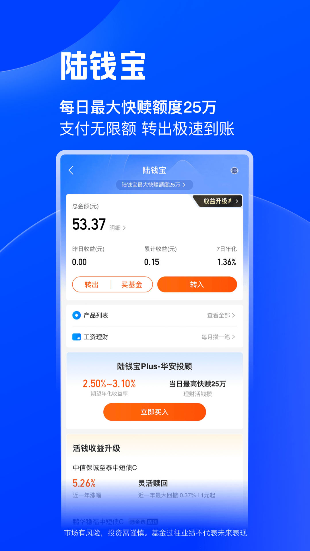 1、陆钱宝:智能转入,每日最大快赎额度25万(实际以转出页面为准),转购基金支付无限额,转出最快1分钟极速到账;