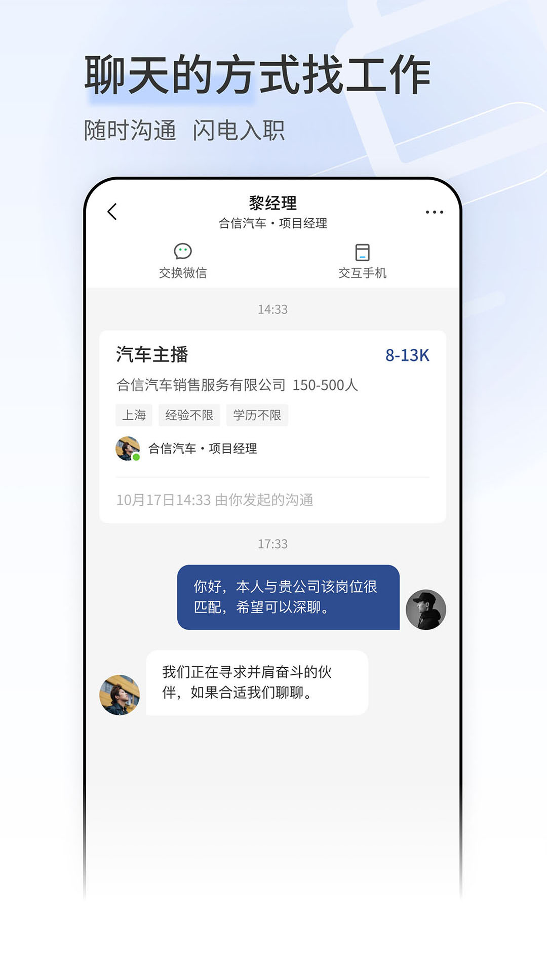 在这里找工作就像聊天一样轻松,就和使用微信App似的,不管何时何地,只要你想找工作,都能随时约聊。而且效率超高,当场就能确定结果,实现闪电入职呢。
