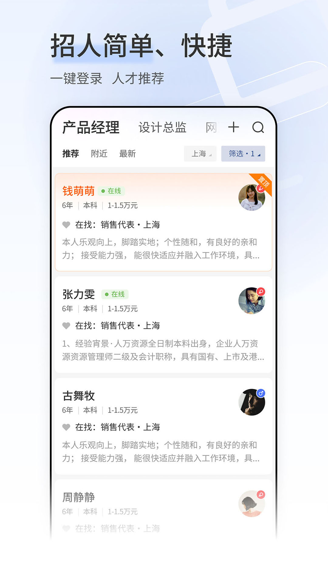 对于企业来说,招人变得既简单又快捷。只需要一键登录,花1分钟就能把招聘信息发布出去,还有智能筛选和算法推荐功能助力企业找到合适的人才。