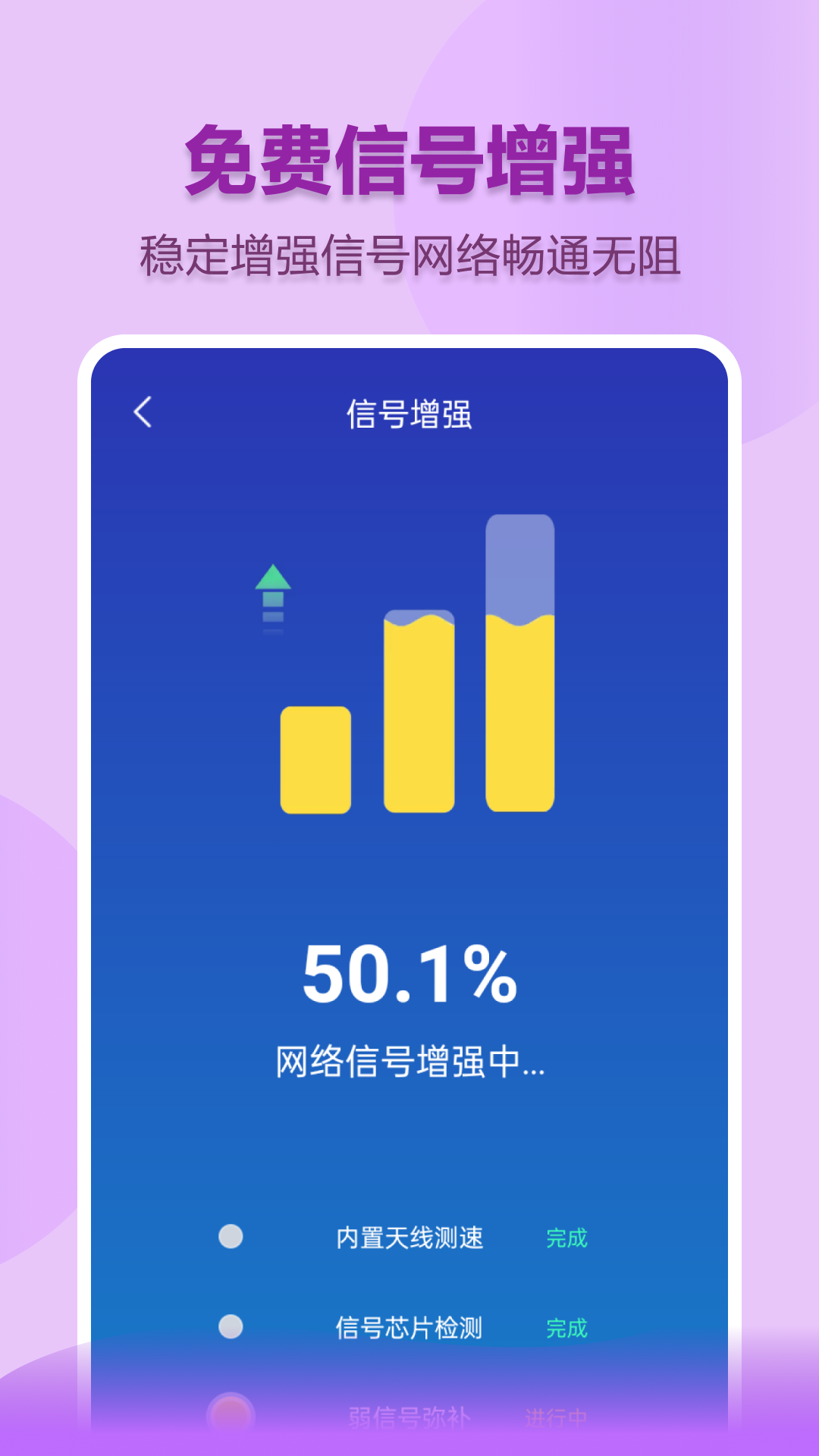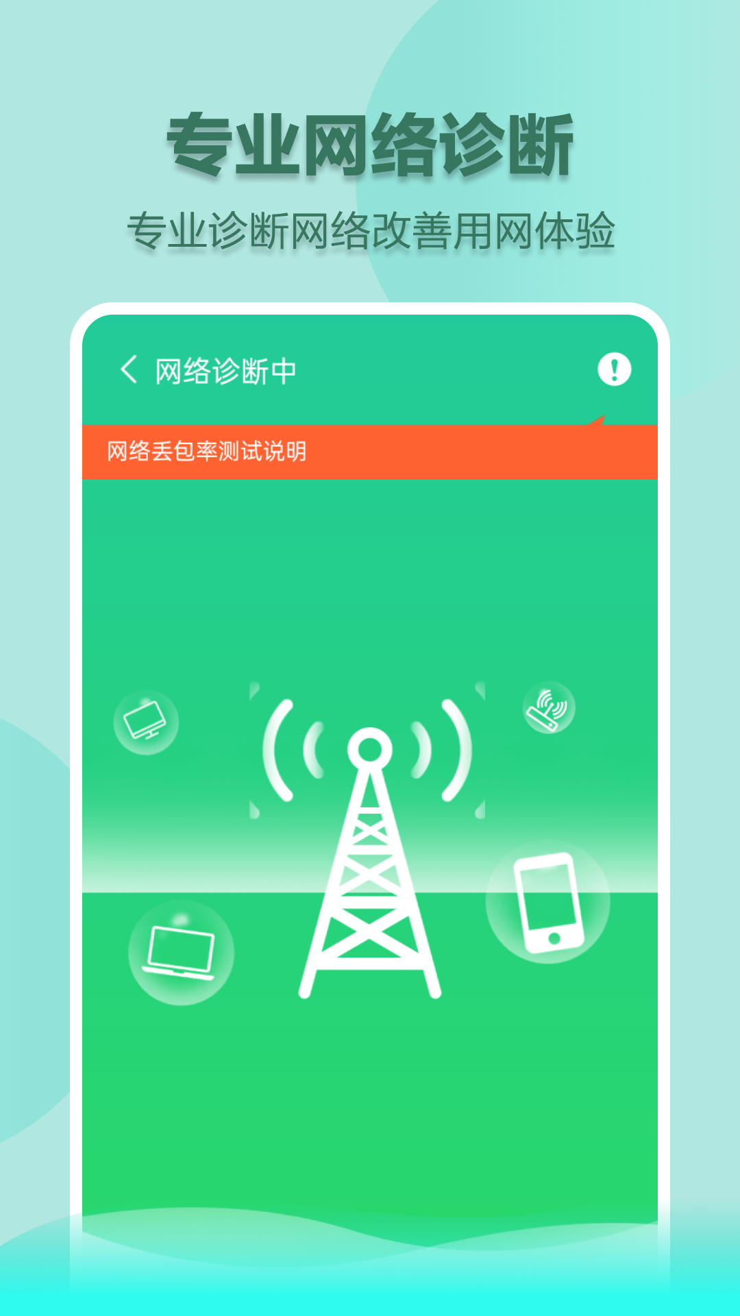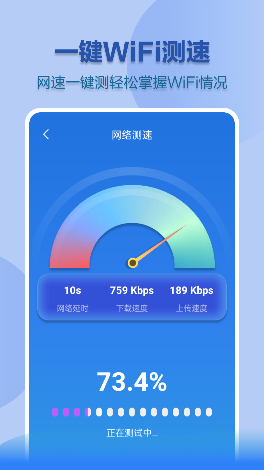 具备【网络加速】【免费连接WiFi】【防止蹭网】【极速上网】【一键网络诊断】等特色功能,非常简单又实用的网络测速工具,结果准确!一键测速:查看手机网速,2G、3G、4G、Wifi都可使用!