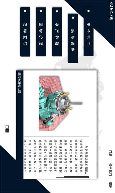 此APP为仿真教学.中国网站的同名应用。当前,该APP展示的内容共分为五大类,分别是电子电工、船舶设备、水产养殖、医学护理以及万物互联。其具体的知识内容介绍涵盖了九个模块,分别为电动机星三角启动控制电路故障处理虚拟仿真、万用表的使用入门、船用大型低速二冲程柴油机结构仿真展示、船用分油机认知、扇贝人工繁育虚拟仿真、养殖水环境化学实验课程系列仿真软件、老年护理虚拟仿真软件、视器解剖、智慧商超。在这九个模块中,电动机星三角启动控制电路故障处理虚拟仿真、万用表的使用入门这前两个模块能够在APP内进行实际操作体验。并且,所有模块的内容均可以通过仿真教学.中国的PC端进行在线体验。