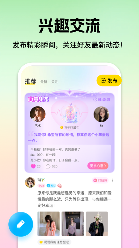 【兴趣交流】您可以发布自己的精彩瞬间,同时关注好友有趣的动态,在兴趣交流中加深彼此的了解。