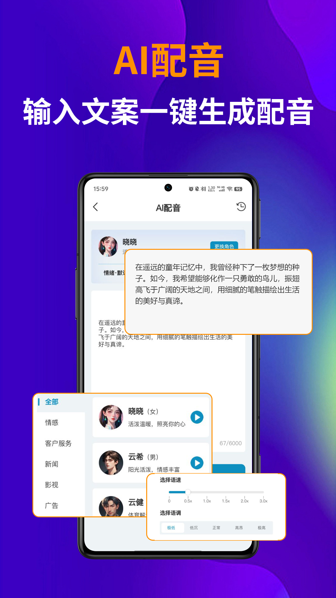 借助AI人工智能技术,AI视频宝能够为您生成多种类型的视频,并且提供各种配音角色选择。您还可以自由调整语速、语调,设置屏幕版式,添加简繁体字幕等,满足您多样化的视频制作需求。