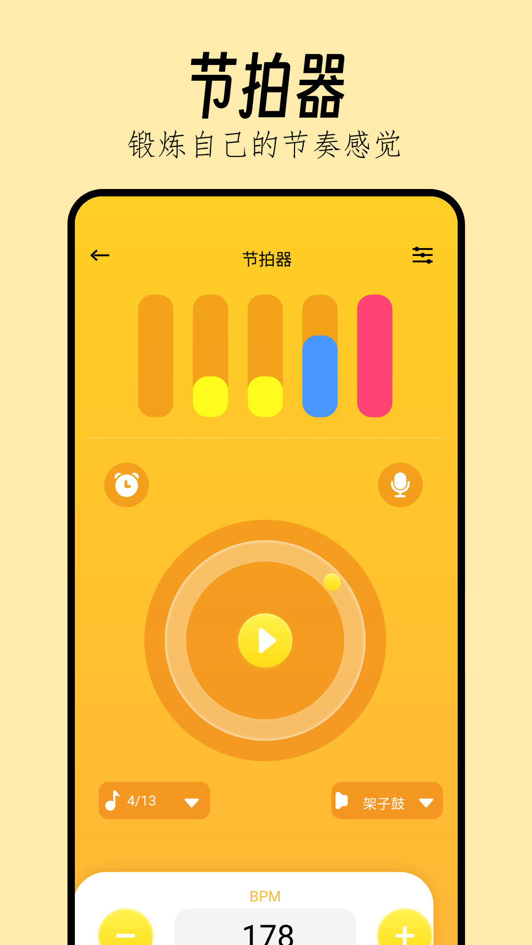 节拍器灵活可调,适合各种曲风和节奏。并且支持自定义节拍模式,能够满足您的各类练习需求。