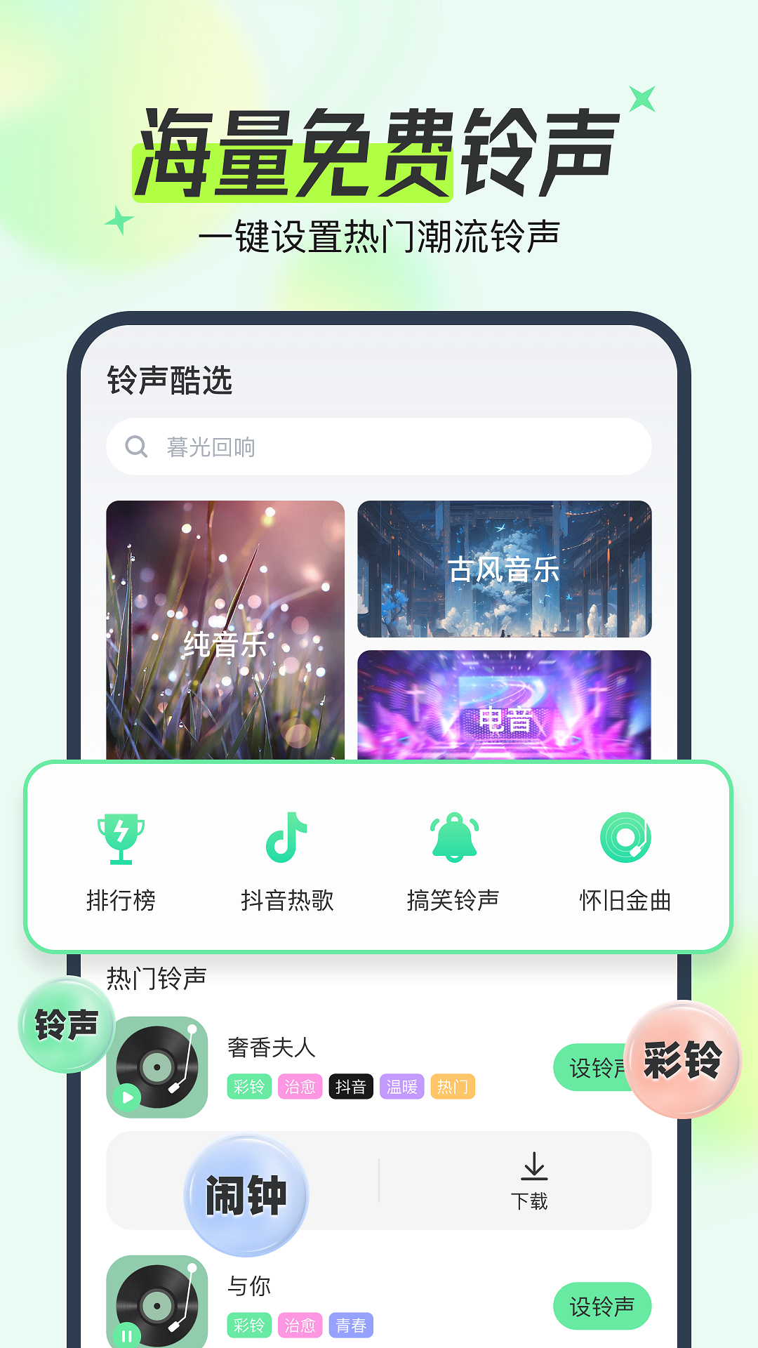 手机铃声、彩铃(炫铃),来电秀视频,短信微信闹铃,充电提示音,视频彩铃……统统打包送给你!