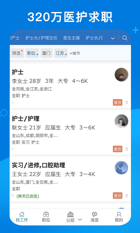 医护人员找工作,就上康强APP,入职速度快,还能免费发布招聘与求职信息哦。