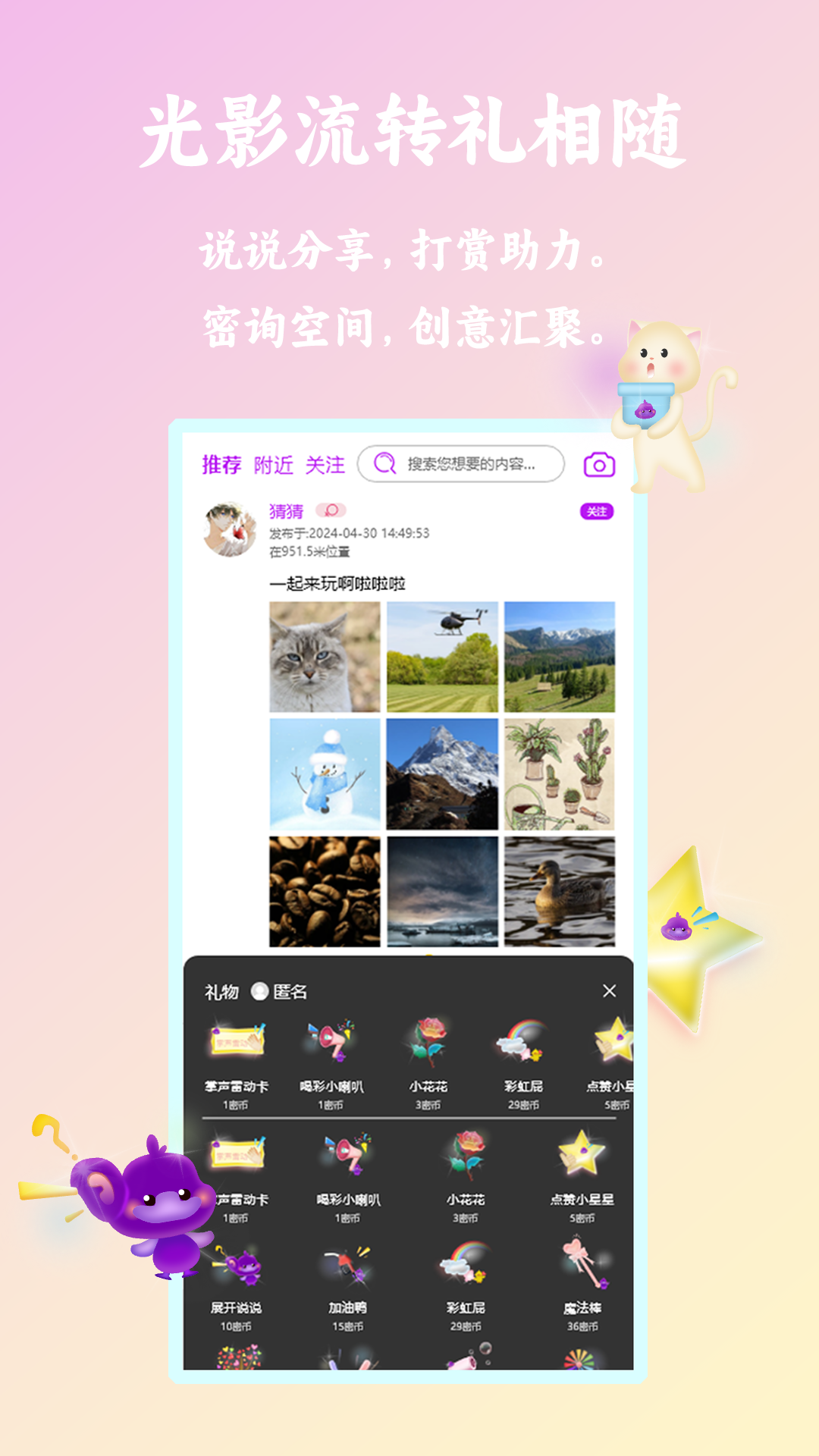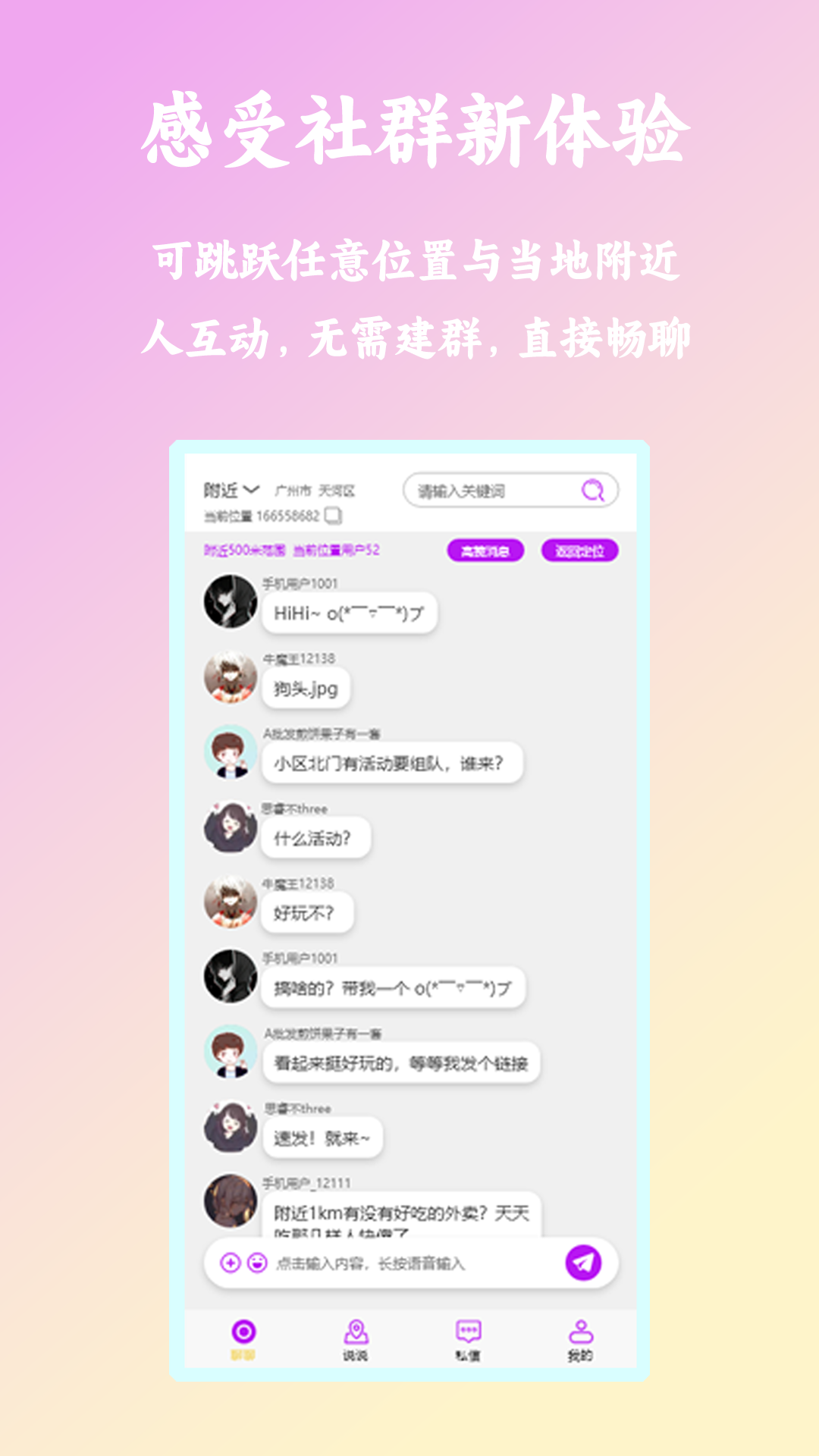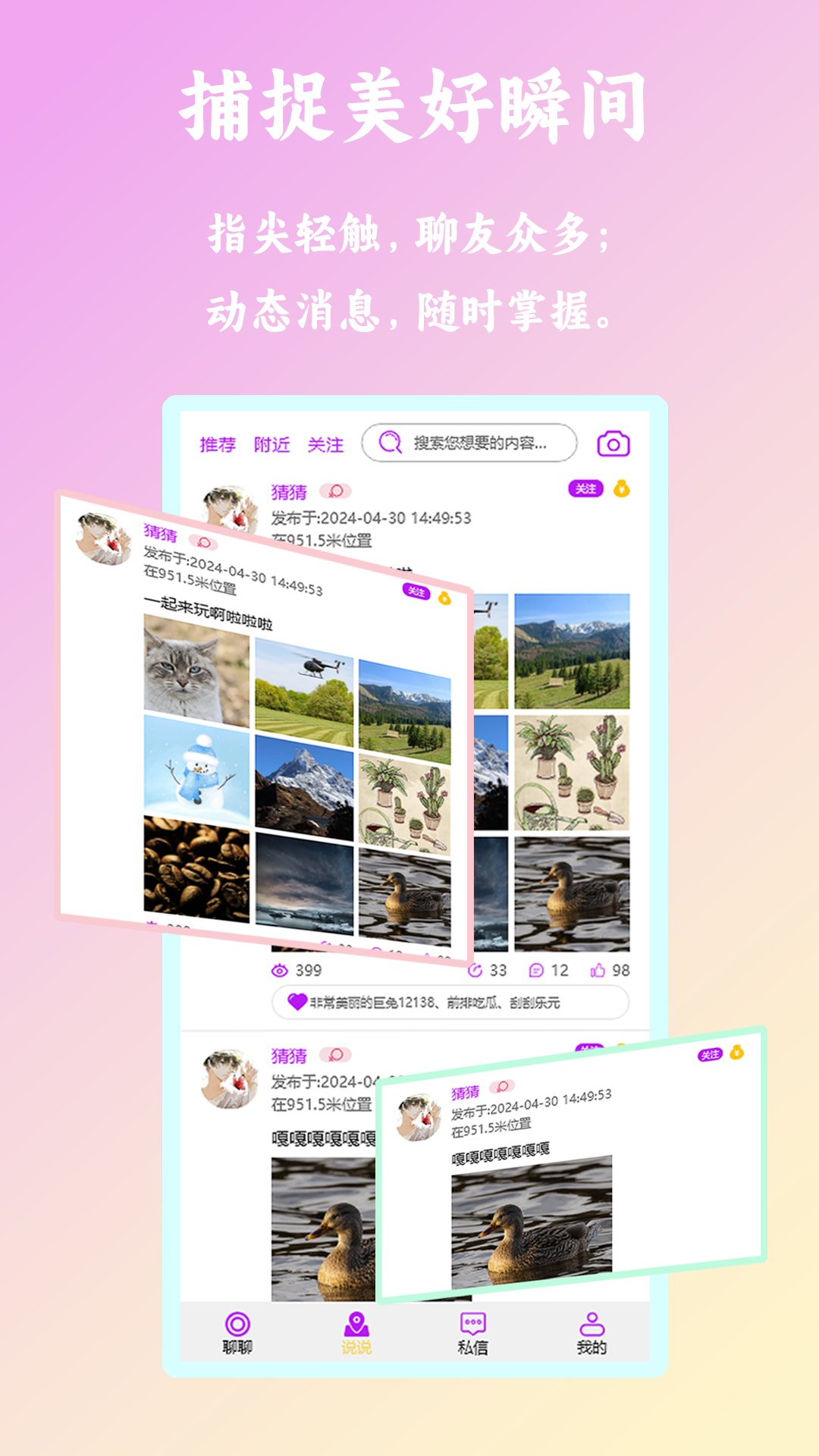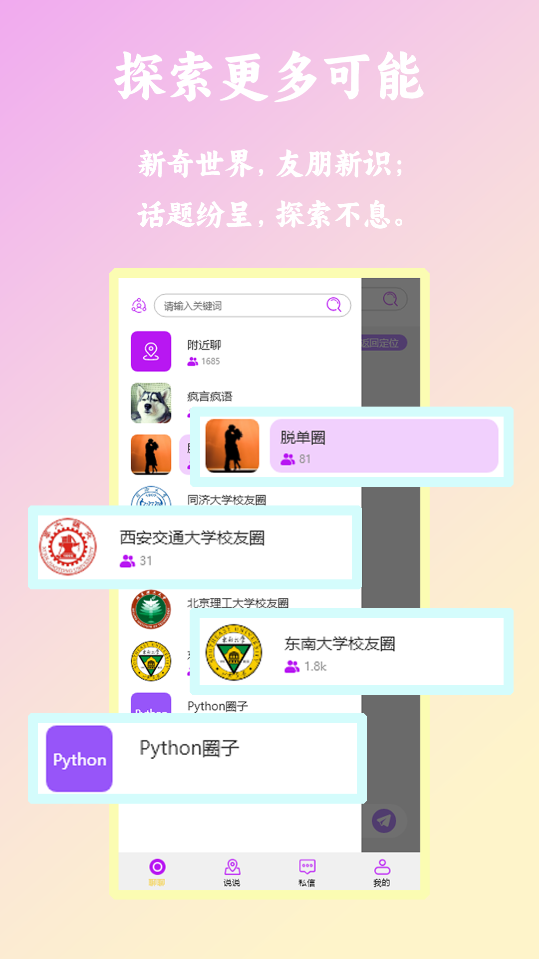 圈子社交,可在喜爱的圈子里认识更多的朋友,在圈子里还有有趣的应用。说说可以地理定位内容分享附近人,私信消息云端加密保存,附近聊更可以跳跃全球定位数字区域,开启元宇宙乐趣