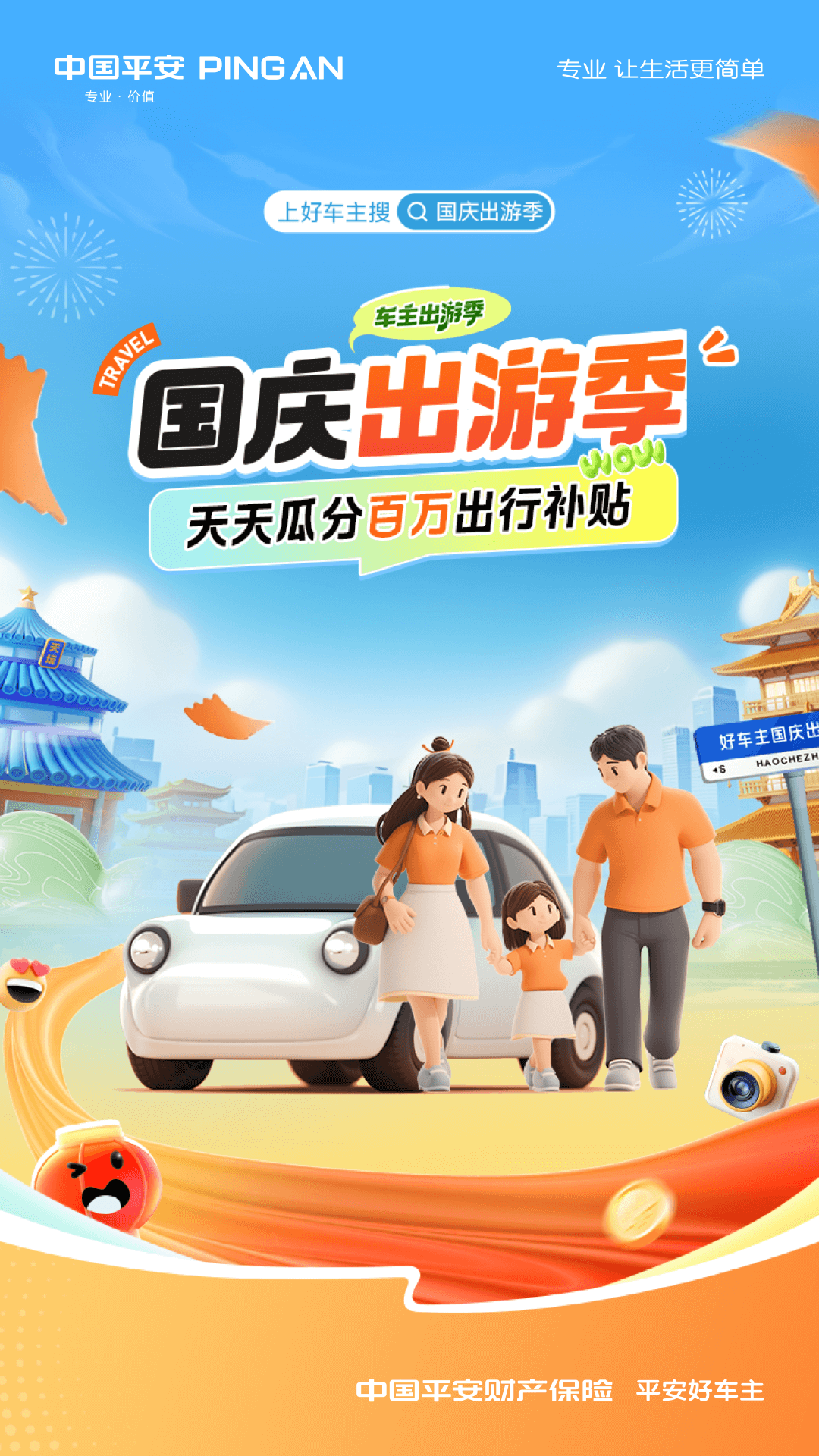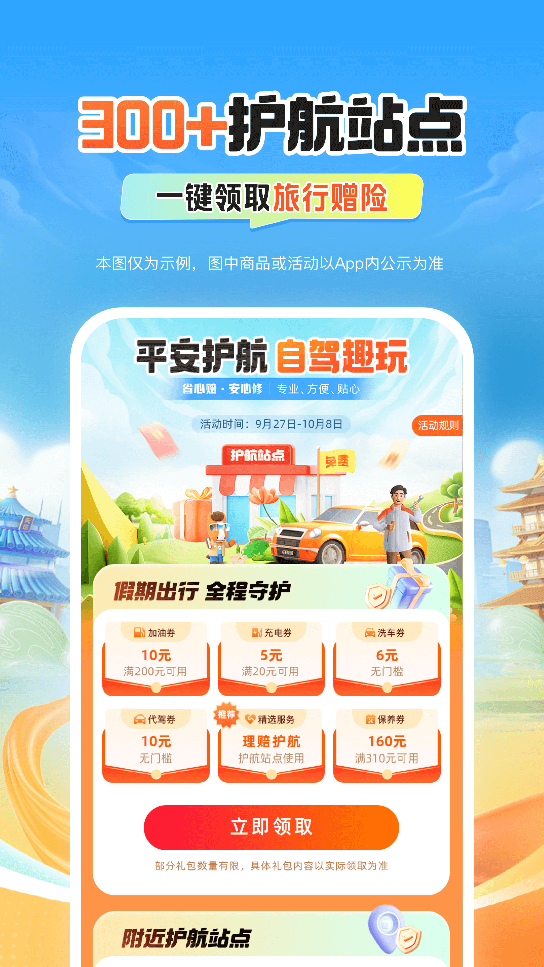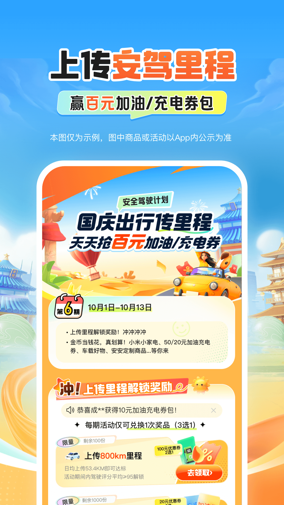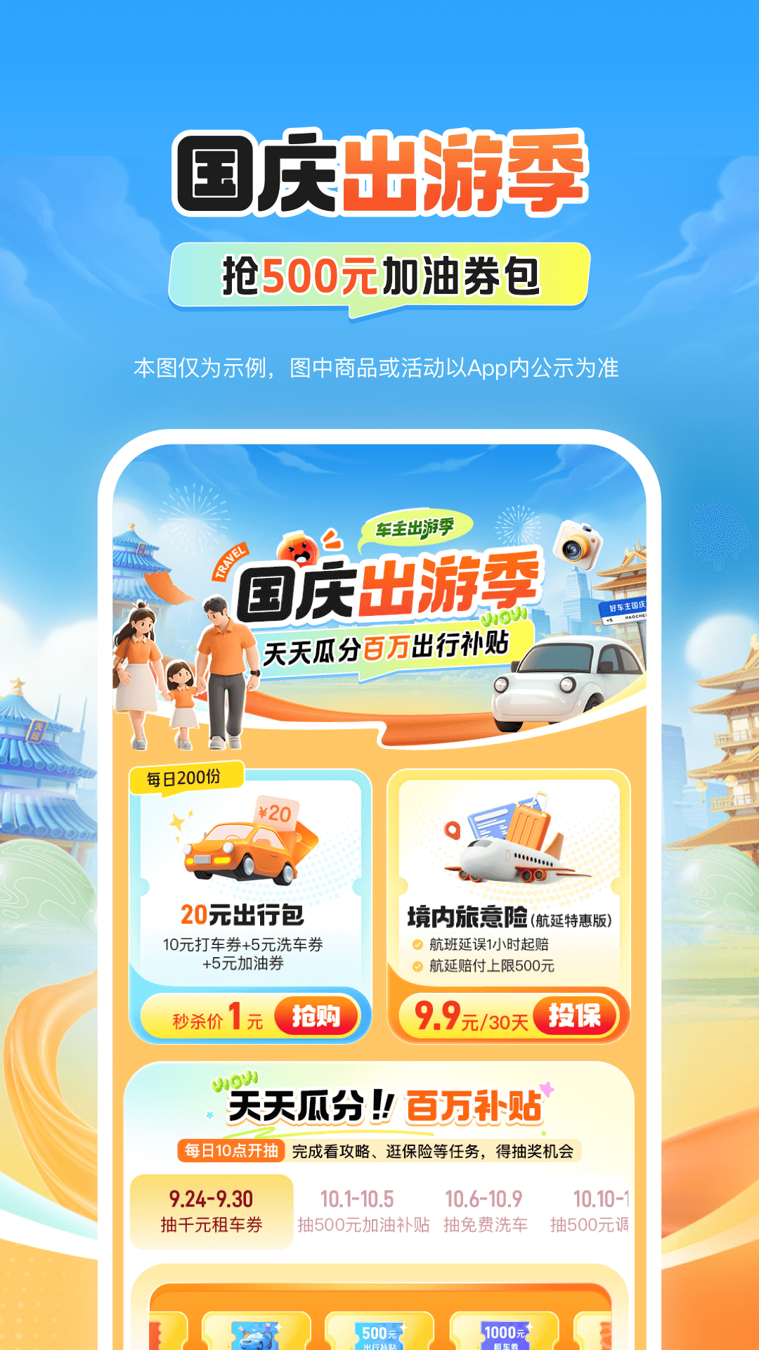 1、国庆出游季,抢500元加油券包; 2、畅游国庆,热销出游保障8折起; 3、300+平安护航站点,守护自驾出行; 4、国庆出行传里程,兑换百元加油充电券;
