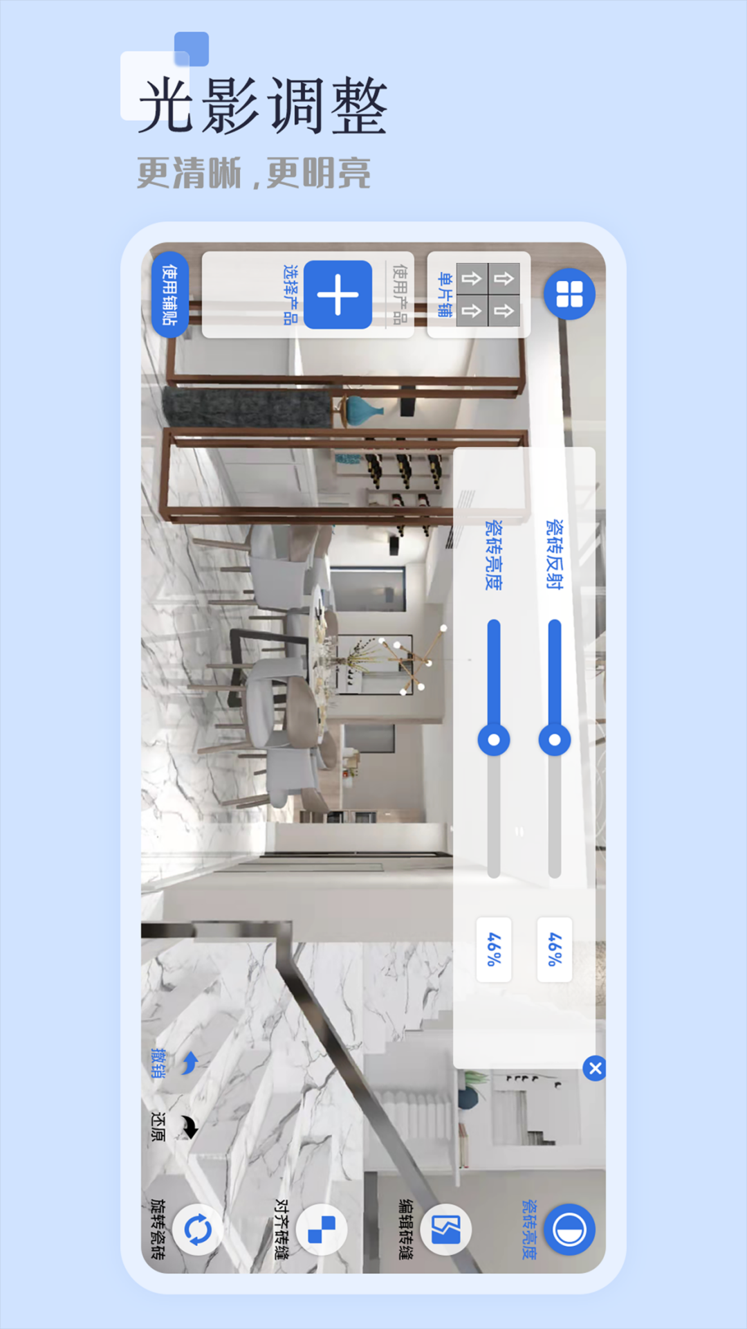 结合瓷砖门店经营,为经销商提供功能强大,支持产品全景效果图制作。真正做到营销快速响应,互动能力提升,产品信息全面,产品体验增强,使团队每个人都充分发挥效能。