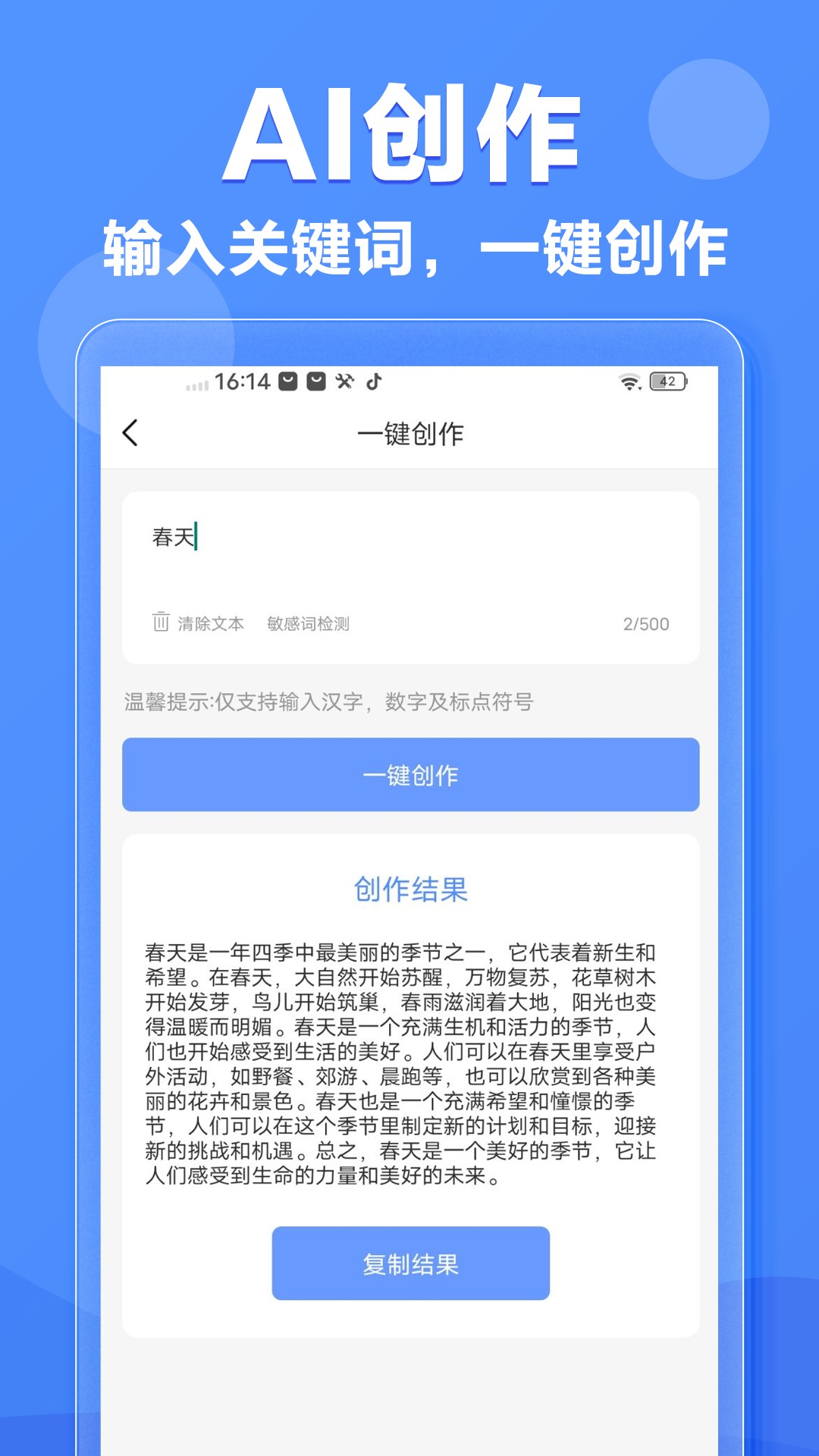 2. **智能写作**:只需输入关键词,就能一键智能创作出文本内容。