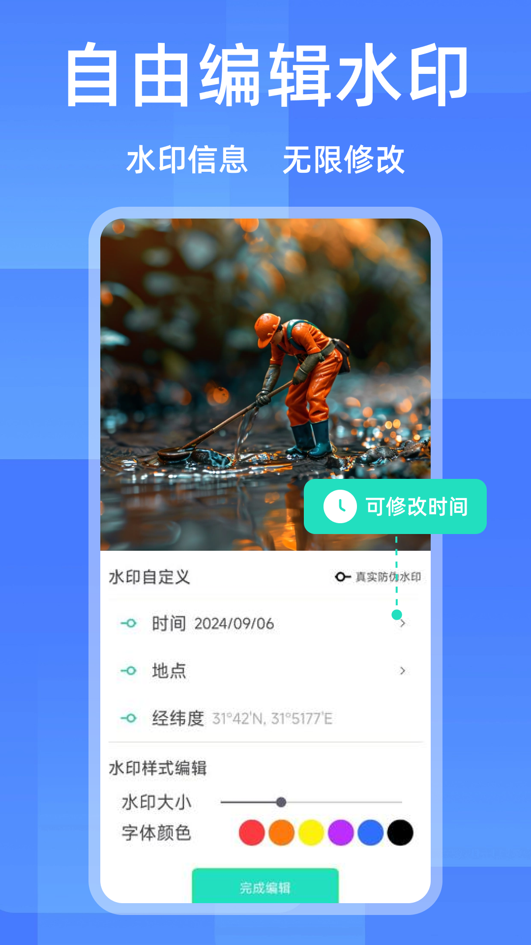 水印自由编辑,水印时间、地点、经纬度、可自定义选择添加备注、标题、修改颜色、修改水印大小等多样化内容,满足不同行业不同用户的个性化需求