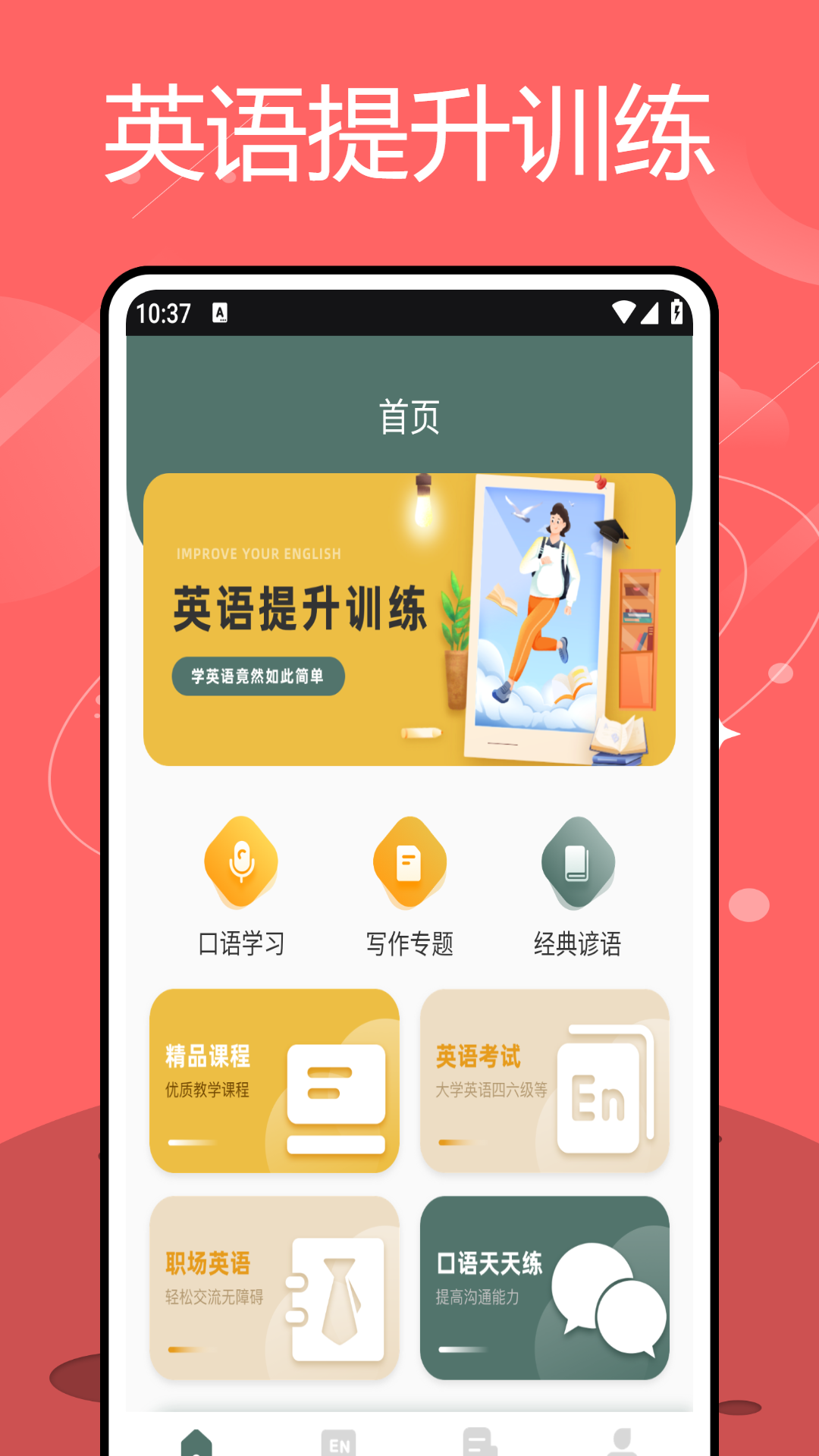 你每天仅仅需要抽出几分钟的空闲时间来学习英语,英语水平就能得到飞速提升。其口语专项训练能够让你在口语表达上妙语连珠;写作专题会使你告别写作烦恼;精品课程确保你随时可以得到名师的悉心指点;有了它,英语考试你能轻松获取佳绩;职场英语部分让你在职场运用英语时游刃有余。