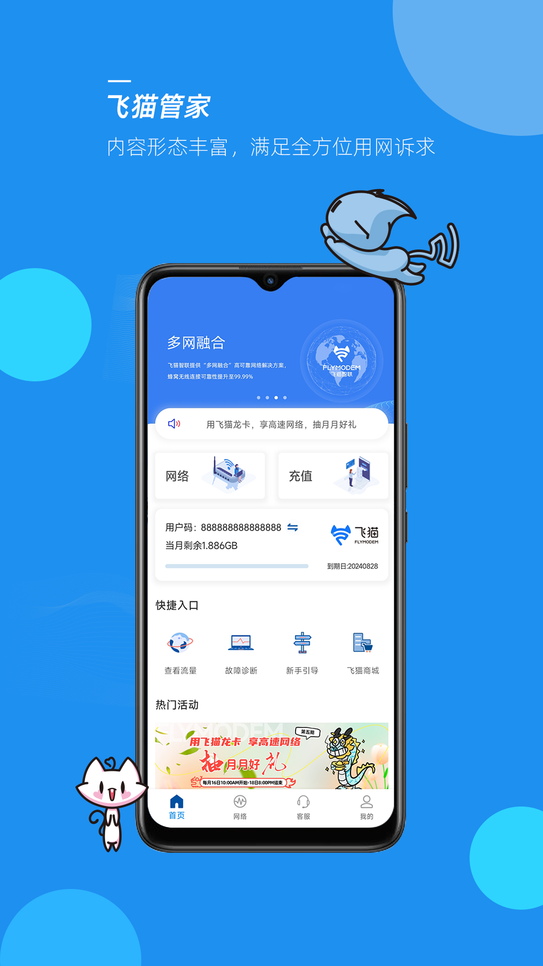 飞猫管家是一款专门为4G/5G移动通信设备开发的专用功能性软件。它具备多种功能,集快速实名认证、设备管理、流量充值、流量查询、精品购物以及客服支持等功能于一身。而且,它能够对多个品牌的多款无线上网设备进行管理,这些品牌包括华为、中兴、OPPO、飞猫智联、华正易尚等。