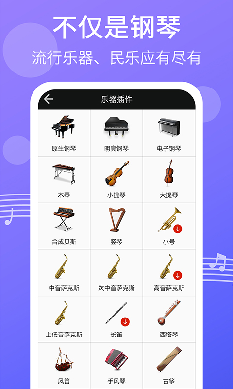 1.完美支持多种乐器音色: 钢琴、吉他、大提琴、小提琴、八音盒、管风琴、古筝、琵琶、二胡、风笛、贝斯合成器、萨克斯、弦乐合奏、电子琴等。不仅支持流行乐乐器,也支持民乐乐器。
