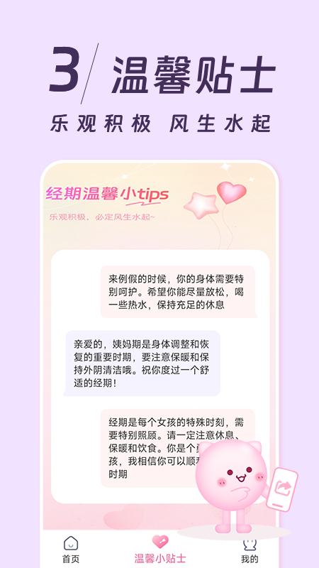 此外,姨妈记还有温馨贴士功能。在这里,您能随时记录并分享自己的心情变化,不管是开心的事还是烦恼的事,都可以得到倾诉,也能收获安慰。您还能与姐妹们一同分享,这样在每个月的生理周期里就不会感到孤单,大家彼此相伴,共同度过每一个特殊时刻。