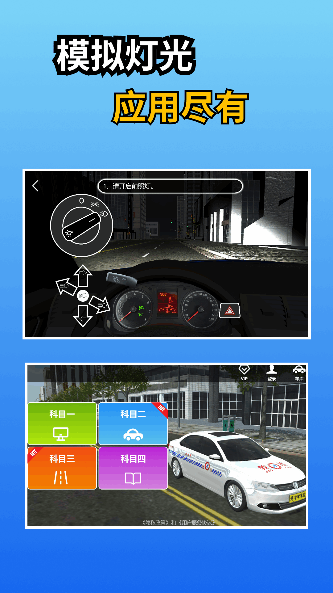 这款APP涵盖了科目二和科目三的练车内容(其中科目三包含灯光模拟),拥有多个3D模拟考试项目。用户可以利用手机随时随地边玩边学,轻松掌握驾考的扣分标准,快速熟悉驾考中的关键点位。而且,它还有权威的科目一、科目四精选习题可供练习,提供一站式驾考服务,让您在驾考之路上毫无忧虑。