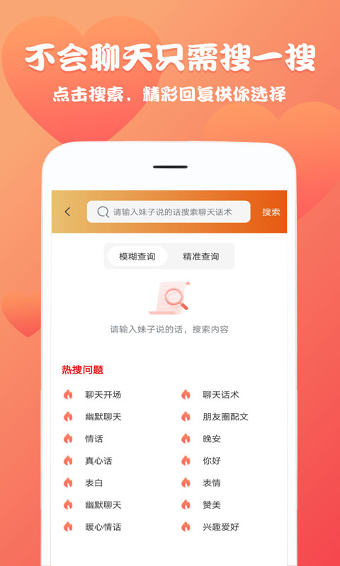一款30万+的智能话术库神器,一键搜索回复妹子说的话,你的聊天小助手,智能分辨聊天话术,语义搜索答案,自动回复说不出口的甜言蜜语,帮助男生解决尬聊问题,情话绵绵,尽情吧
