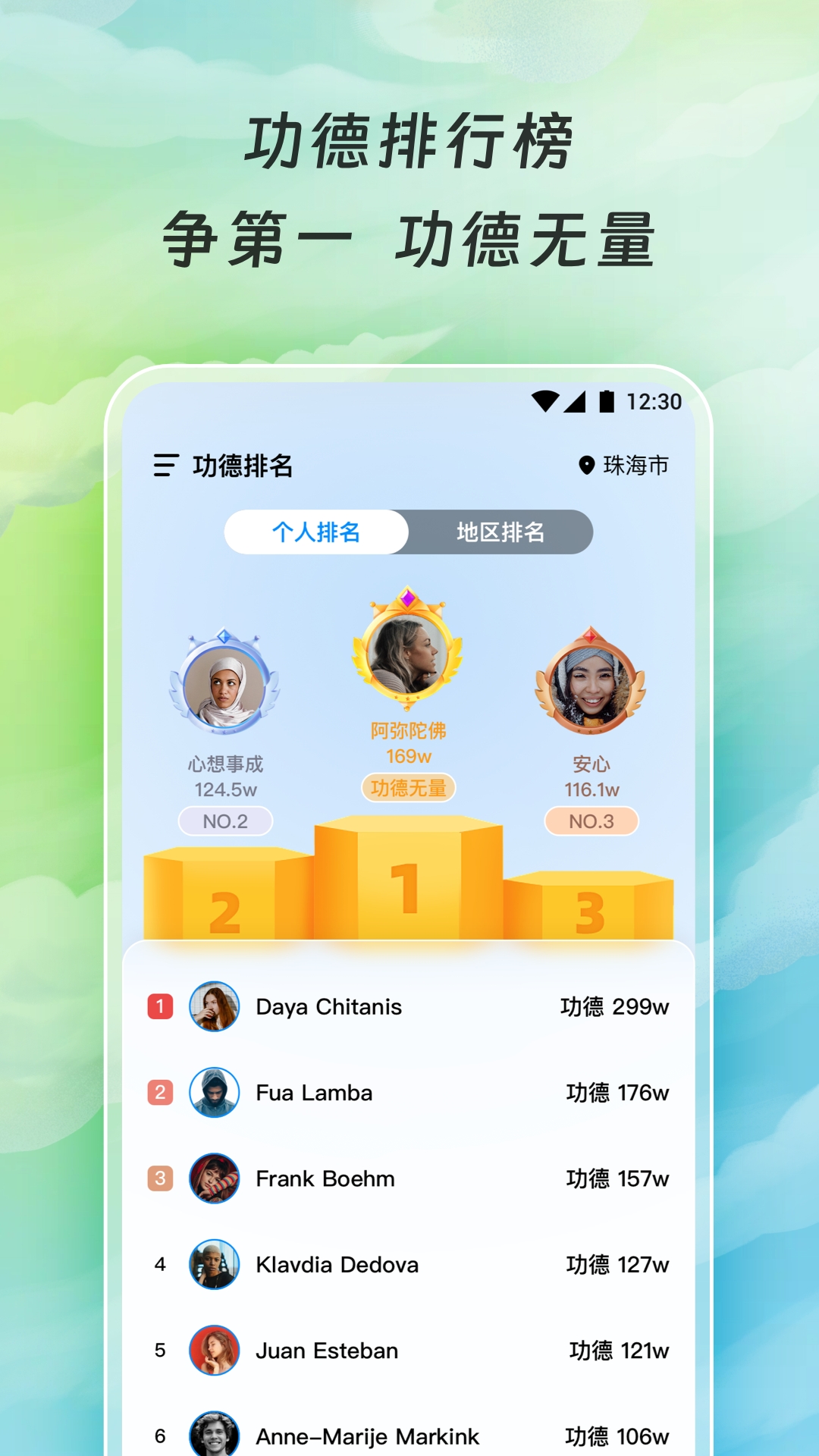 【功德排行】用户可以查看自己以及所在地区的功德排行情况。这一功能能够进一步增加用户的沉浸式体验,让用户感受到自己在整个功德积累体系中的位置,激发他们持续积攒功德的热情。