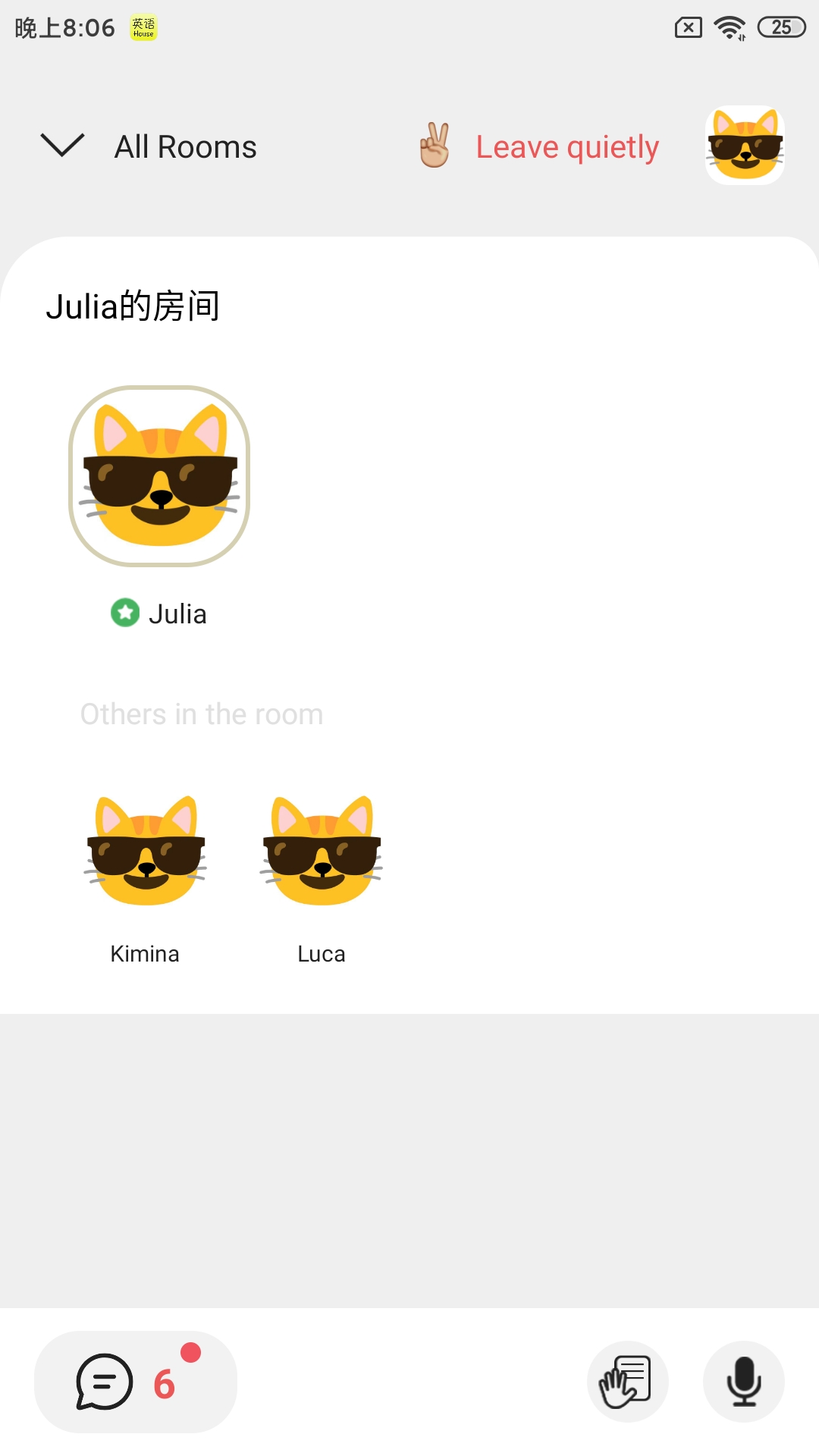 英语屋的特色是声音,也就是在语音房里用英语聊天,打造一个高效、简洁的线上英语角空间。 希望把这个平台打造成只有你的朋友以及朋友的朋友欢聚一堂的地方,在这个地方你可以像在现实生活中一样做自己并闲逛。