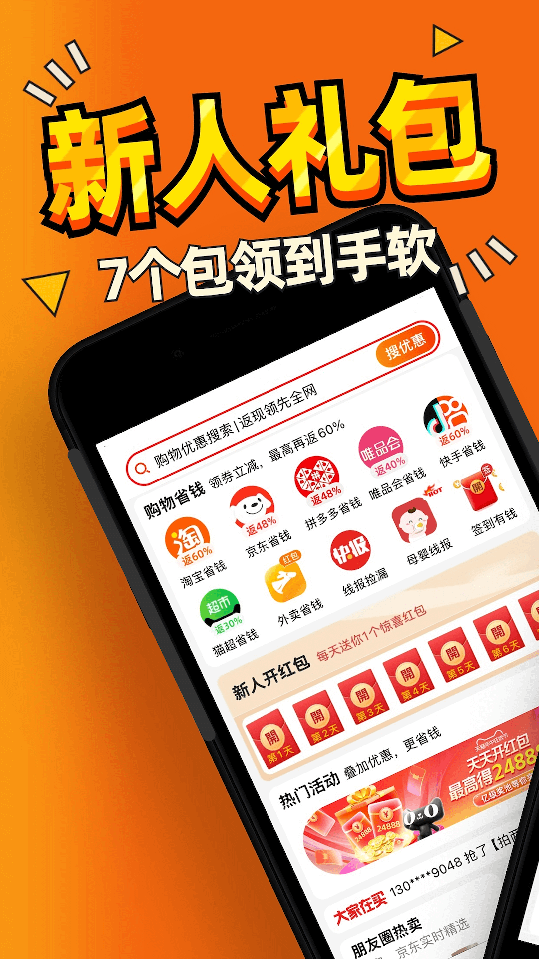 >专注购物返利3年,一键搜索淘宝、天猫、京东、拼多多、抖音、快手、苏宁易购、亚马逊、唯品会、网易考拉、严选、吃货笔记等国内外优秀电商平台优惠信息