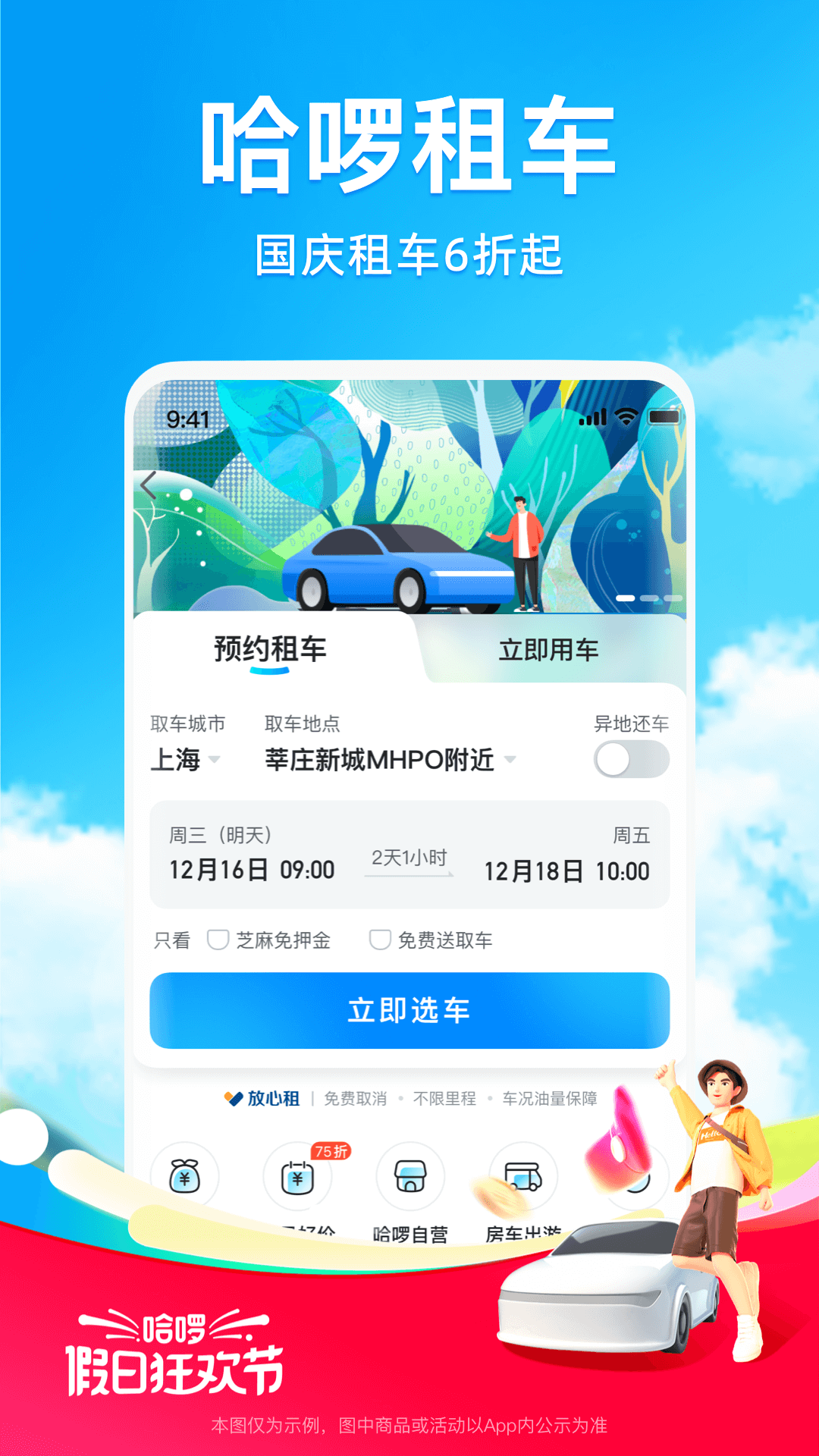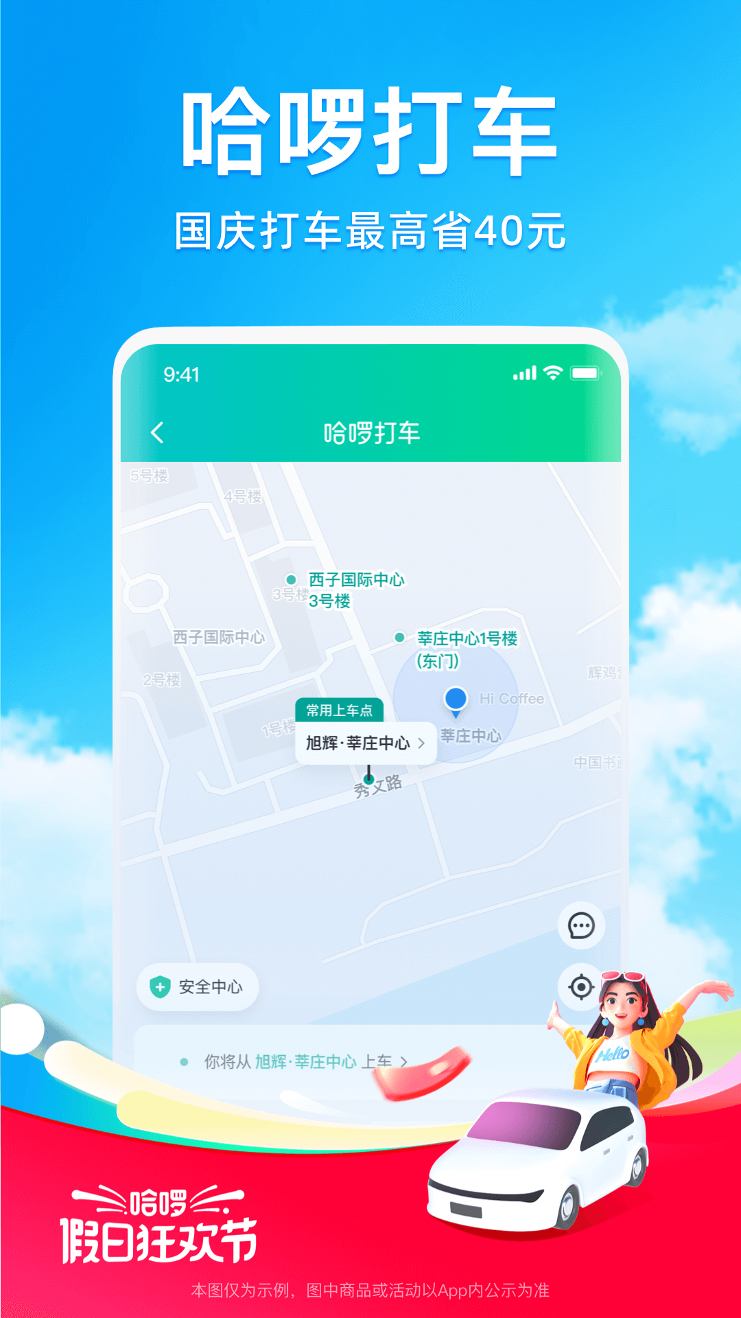 【哈啰假日狂欢节】<br>哈啰假日狂欢节现已正式开启!超多0元兑、免单、秒杀、拼团、购券等活动等你来参加!<br>【哈啰顺风车】<br>国庆单单补,多赚50%!20万份免PK卡限时发放!<br>还有新车主专属首单奖励加码哦!<br>线下交易治理全面升级,保障司乘保险全程生效,出行更安全!<br>【哈啰加油】<br>假期狂欢,加油最高省50元,大额券包低价抢!<br>【哈啰充电】<br>假期狂欢,充电享5折,限时送充电免单!